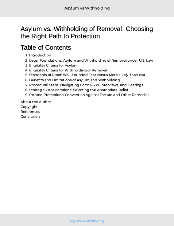 "Asylum vs. Withholding" delves into the intricacies of U.S. immigration protections, highlighting the critical differences between asylum and withholding of removal. It guides readers through the complex eligibility criteria, evidentiary requirements, and procedural nuances essential for those fleeing persecution. This essential resource equips advocates and applicants with the knowledge to navigate the challenges of securing safety and stability in the U.S.
