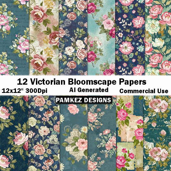 AI Vicorian Bloomscape Papers, Seamless Pattern, Digital Scrapbook Paper Pack, Commercial Use