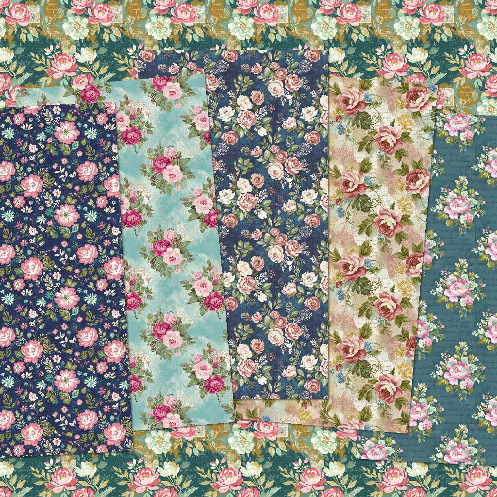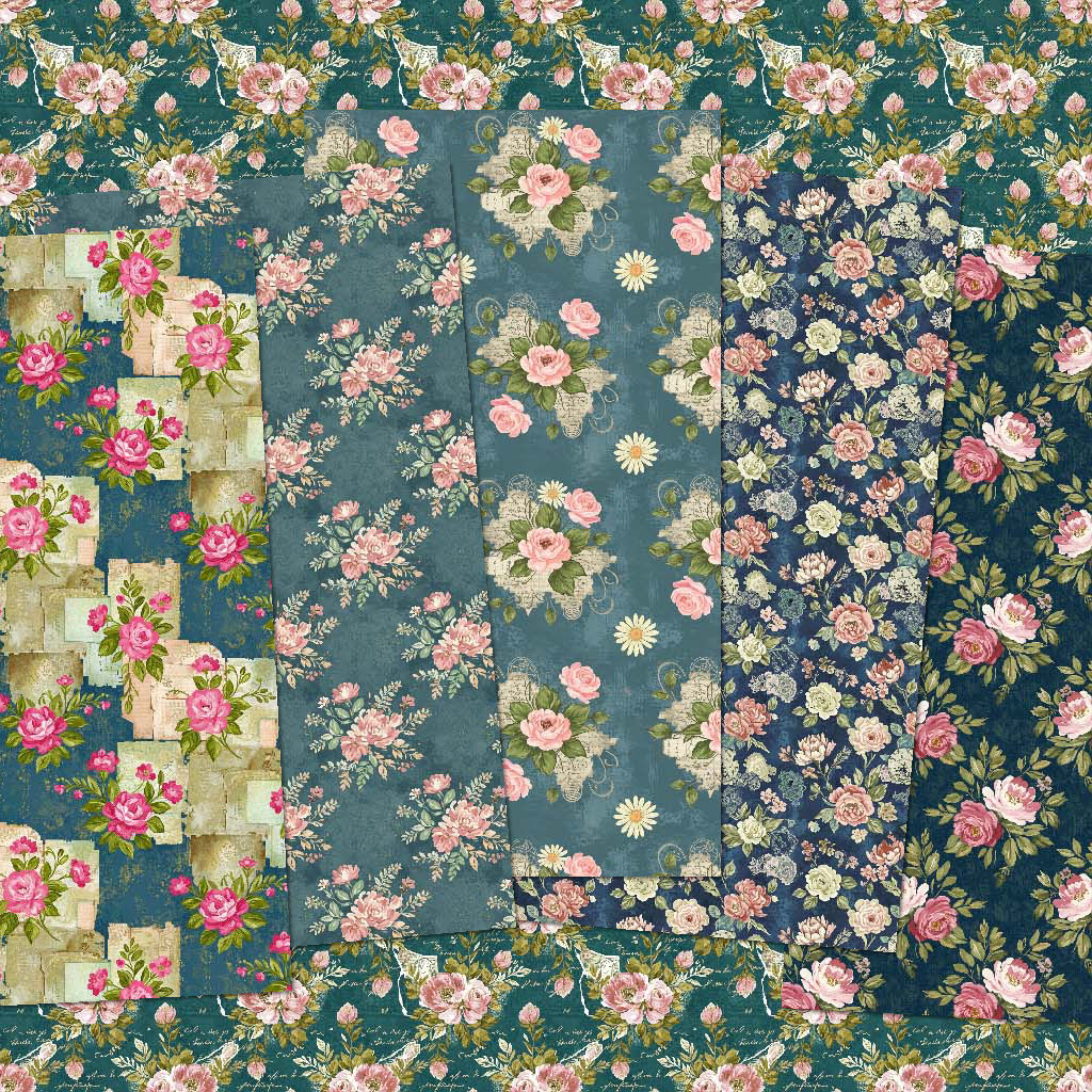 Step into a world of timeless elegance with Victorian Bloomscape, a curated collection of seamless floral patterns inspired by vintage tapestries and romantic garden scenes. Each paper features hand-painted rose motifs, delicate lace accents, and rich, layered textures in hues of teal, blush, and midnight blue — perfect for junk journals, scrapbooking, card making, and digital design.