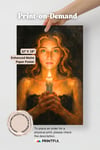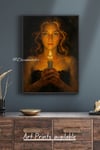 This evocative artwork features a mysterious young woman bathed in the warm glow of candlelight, her piercing green eyes reflecting the flame’s gentle flicker. Rich, textured brushstrokes create a timeless oil painting effect, bringing depth and emotion to every detail. Perfect for lovers of gothic art, moody home decor, or anyone drawn to expressive, dramatic wall art that tells a silent story of light and shadow. Whether displayed as a framed painting or part of your home wall art collection, this piece adds a warm, atmospheric touch to any space — ideal for living rooms, art walls, bedroom or gallery setups.