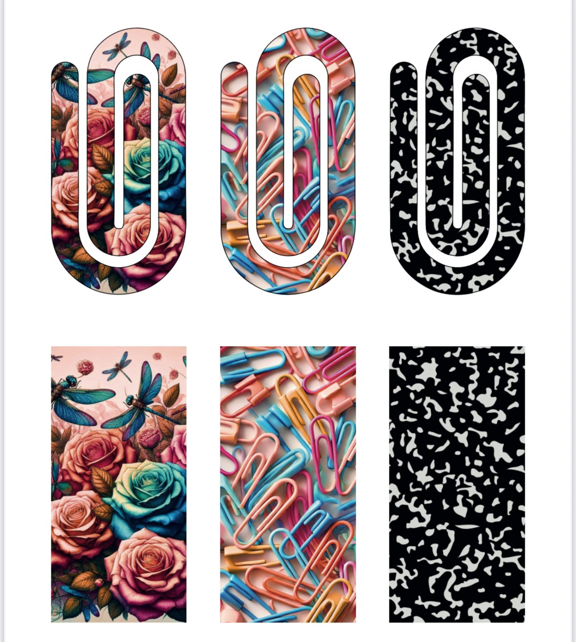 Create bold, beautiful paperclip and bookmark accessories with this easy-to-use sublimation design set! Each page features three trendy designs, with two formats per design: a paperclip shape and a matching rectangle—both sized at 2x4 inches. These designs are perfect for sublimatable blanks and are arranged so you can use them as a front-and-back pair or press them separately on individual clips or bookmarks.