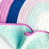 Wrap your little one in comfort and color with this handmade rainbow baby quilt, ready to ship and perfect for gifting. Featuring a one-of-a-kind rainbow in soft purples, teals, and aquas, this cozy quilt brings a dreamy, whimsical feel to any nursery.
