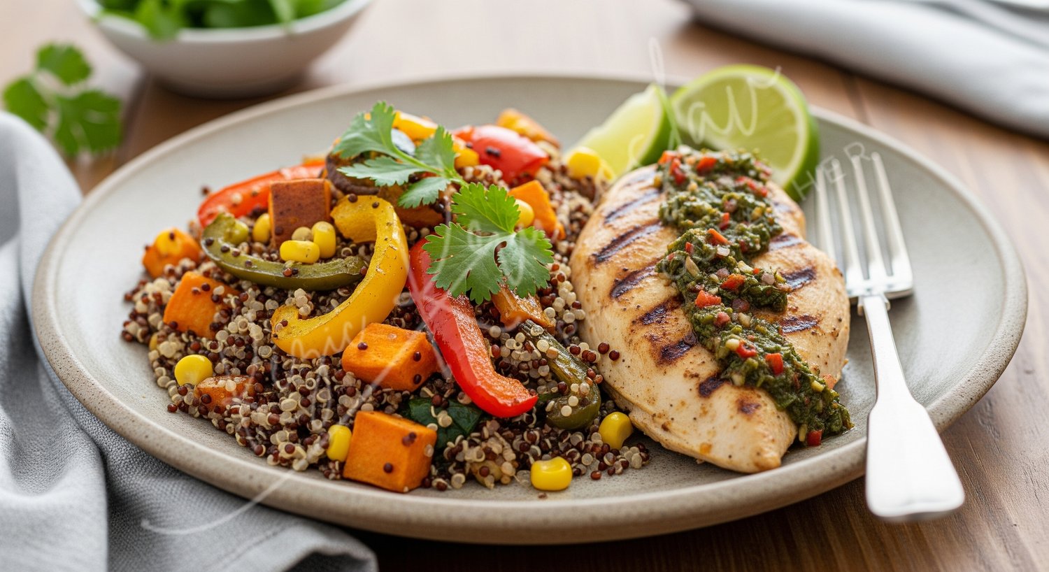 Bold flavors meet peak nutrition. This high-resolution photo showcases a perfectly grilled chicken breast topped with a vibrant, herbaceous chimichurri sauce. It’s paired with a nutrient-dense mix of red and white quinoa, roasted sweet potato cubes, bell peppers, and golden corn. A splash of lime and fresh cilantro adds that final gourmet touch.