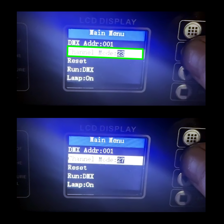 * Verifique, desde el display del equipo, que el menú "Channel Mode" muestre 23 y 27 (ver tercer foto).
