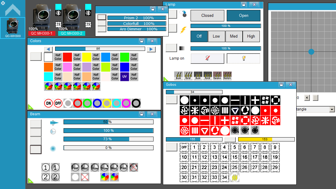 * En el Modo de 23CH Verifique, con el Fixture de pruebas de 30CH (click), que coincidan estos canales: 3 Dimmer, 2 Strobo/Shutter, 1 en el valor 86 = Celeste, 4 en el valor 34 = Gobo de la cuarta foto, 9 foco, 17 Dimmer del Aro Led, 20 Azul del Aro Led.