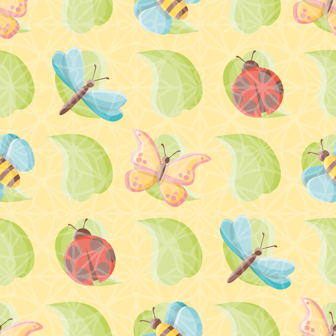 Leaves and bugs seamless vector pattern. Cute illustration background for children.
