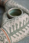 Inspired by the textiles of the Italian Renaissance, the Firenze mittens come in two sizes, with separate charts for each size. The mittens have a Scandinavian thumb and braiding on the cuffs, and are finished with a three-needle bind off. A matching cowl pattern is also available.
