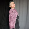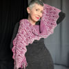 To work in the round, the piece is knitted as a big circular swatch leaving approx. 20 cm of yarn between the ends of each row. These floats are later cut and trimmed to form a fringe on both short edges of the stole.