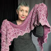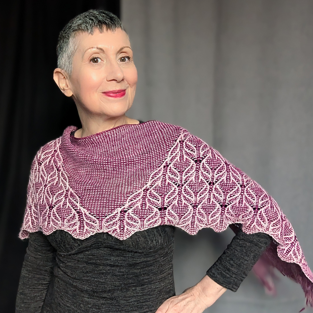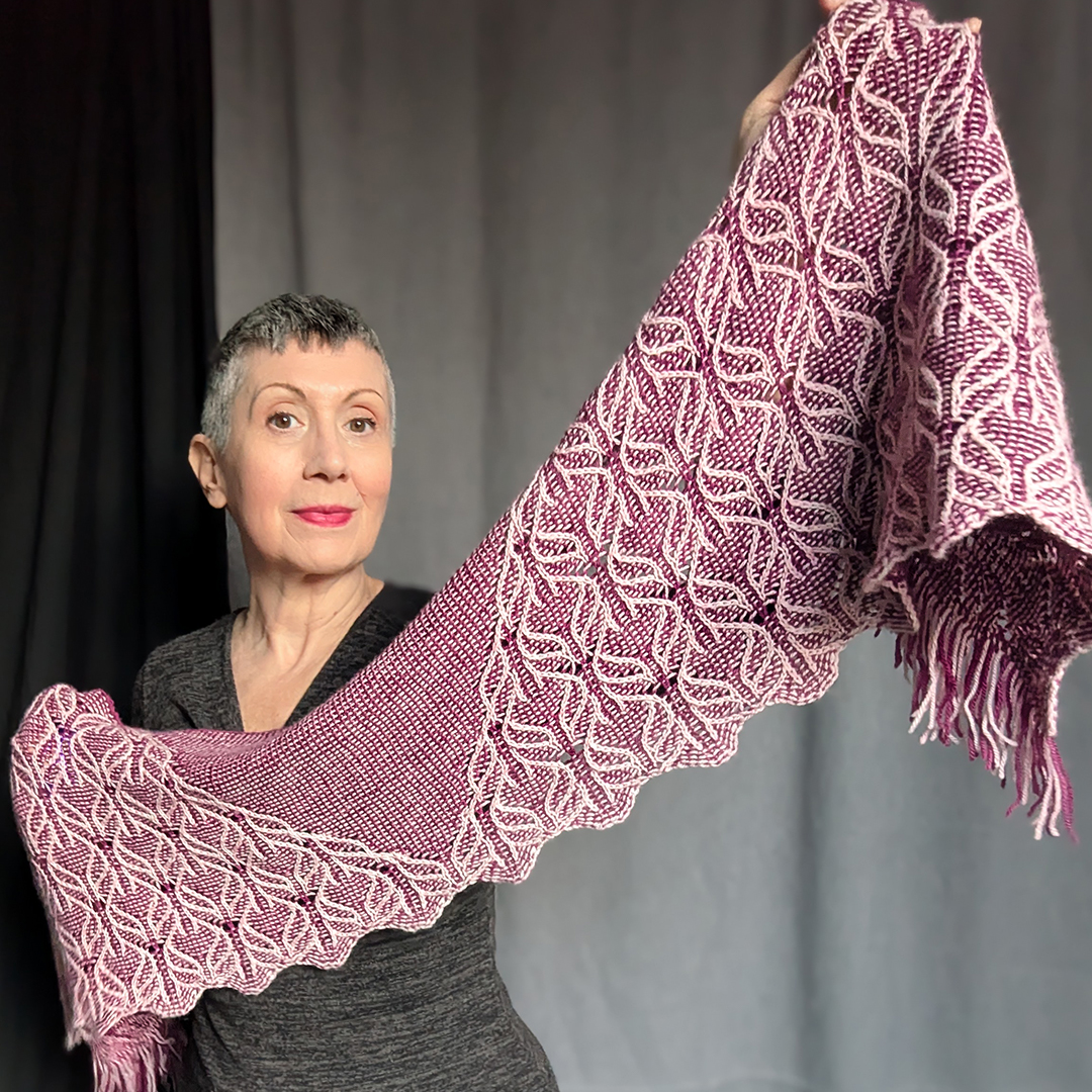 As the lace motif fades and gives way to plain garter, the triangular area becomes more prominent, emerging from the center of the fabric. The piece is designed to be adaptable: you can stop knitting at any point and still achieve a visually balanced result.