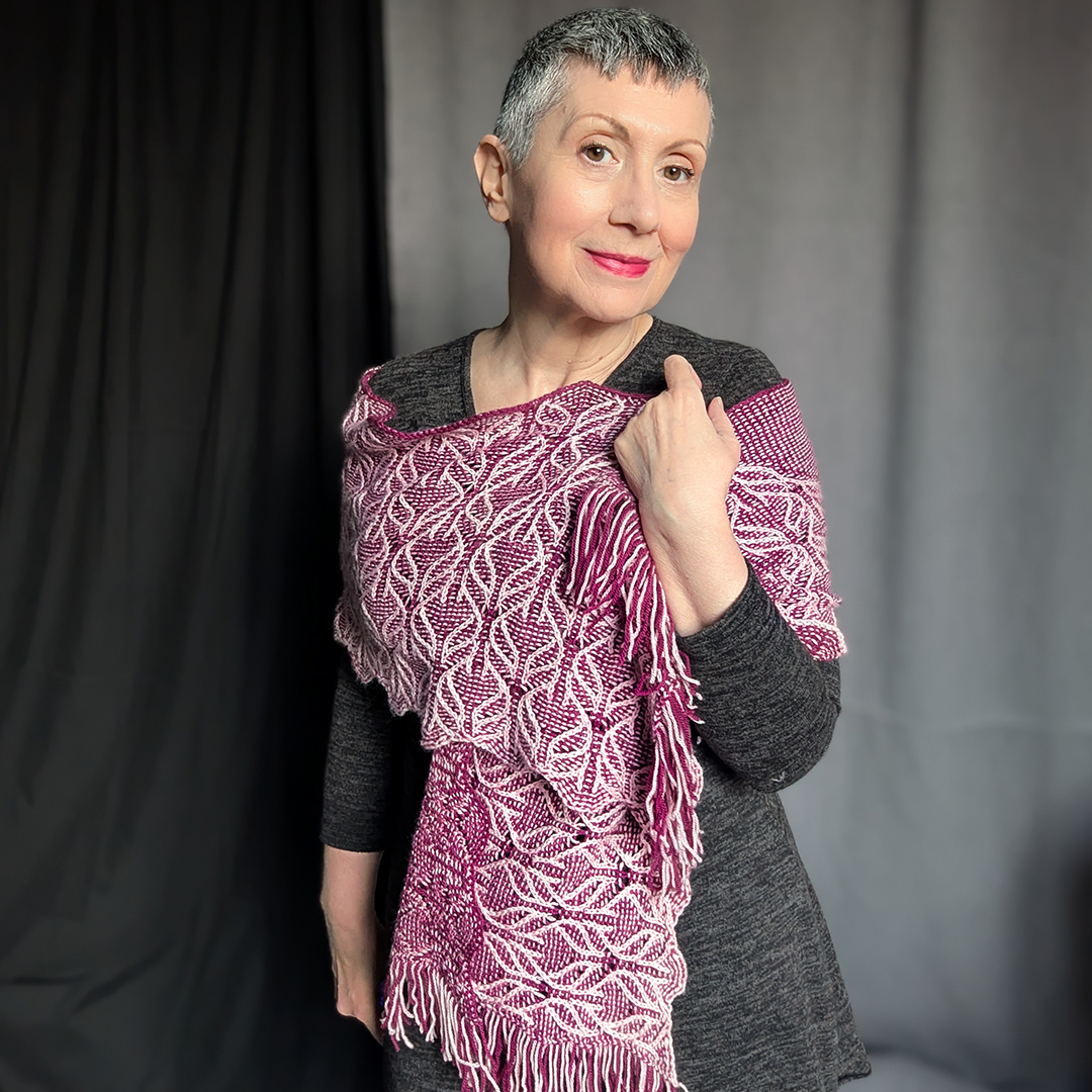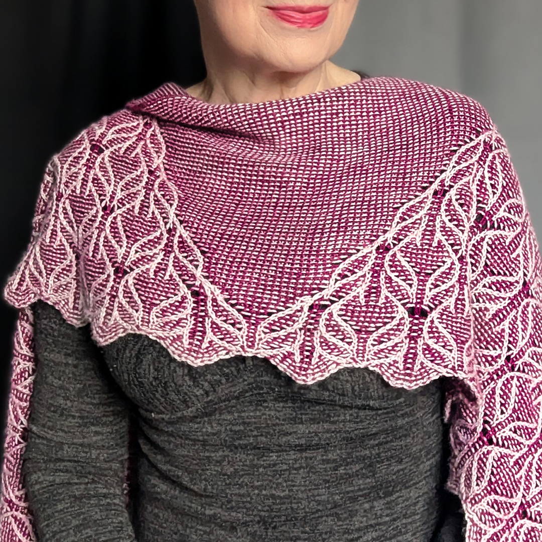 This stole is worked from the bottom up in the round. The stitch pattern transitions from a richly textured lace panel at the bottom to a simple garter-based section at the top, creating the illusion of a triangular shawl embedded within a rectangular shape.