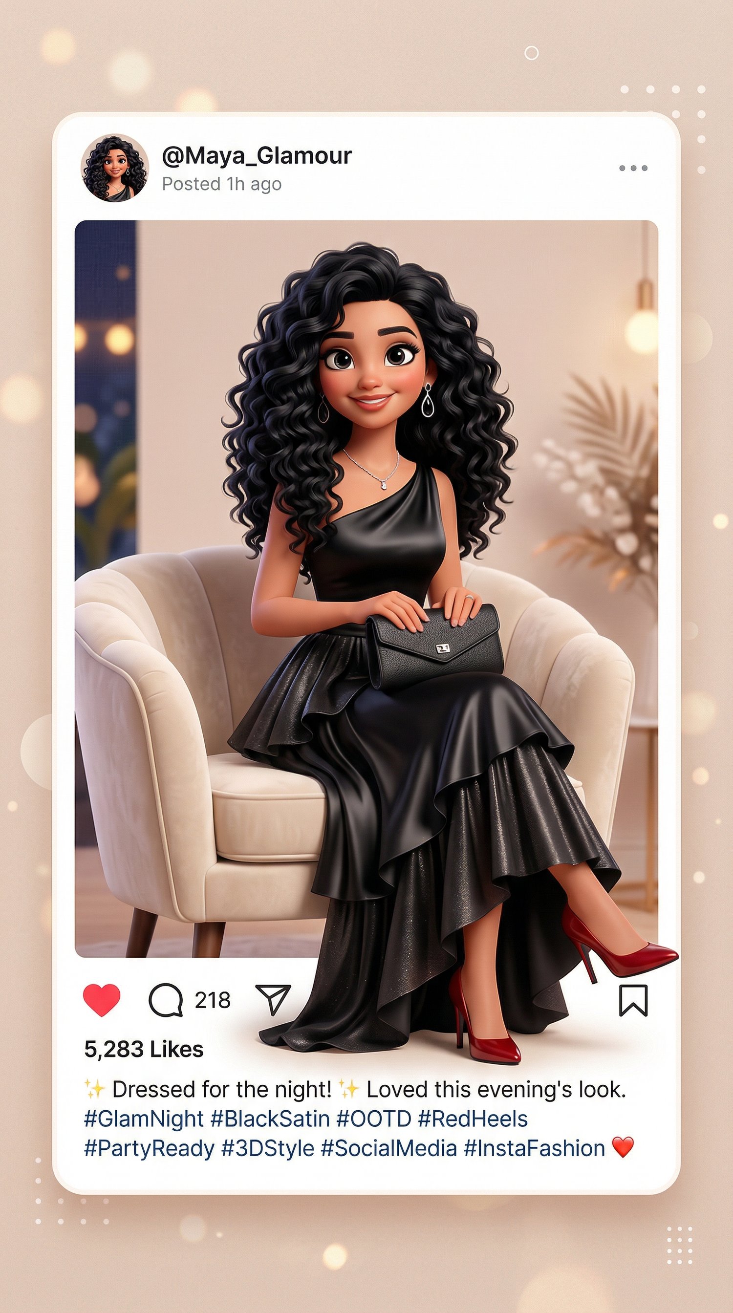 Step into a modern, stylish world with a stunning 3D cartoon-inspired woman sitting gracefully inside a social media frame. Her long raven curls, big expressive eyes, and soft smile radiate charm, while a black satin evening gown, red heels, and elegant accessories elevate her sophistication. Set against a clean, pastel beige interface with subtle likes and hearts, the composition combines Pixar/Disney-inspired 3D design with ultra-realistic textures and polished lighting. Perfect for creators seeking playful yet refined, high-detail imagery that merges fashion, social media aesthetics, and cinematic character design.