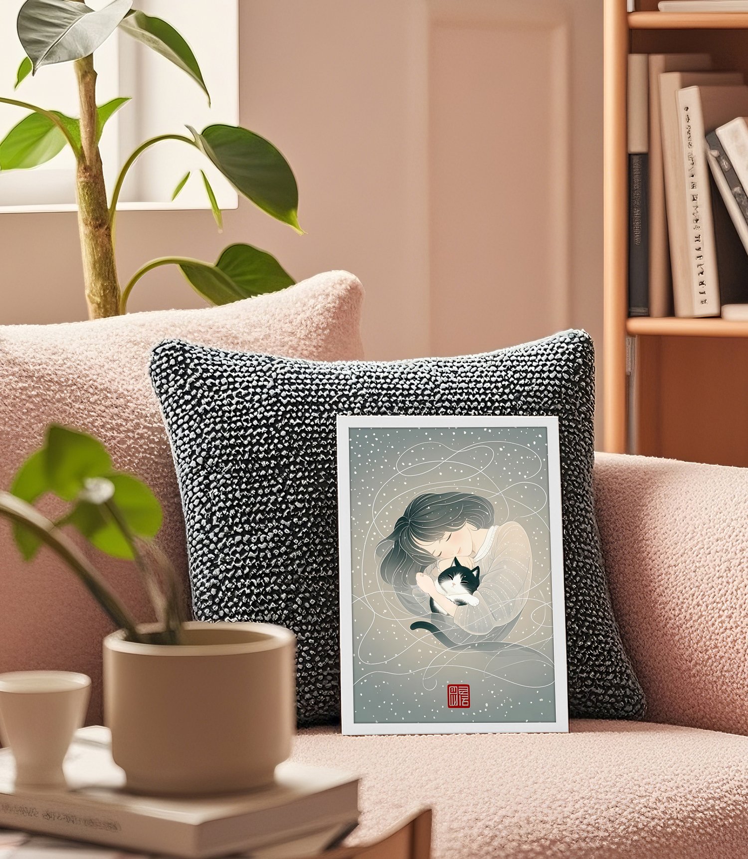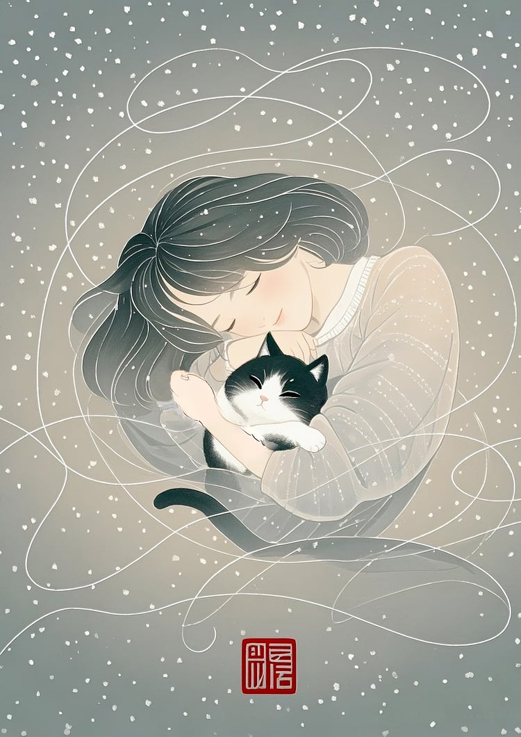 This artwork captures a serene and heartwarming atmosphere through its soft color palette and delicate linework. The scattered snowflakes in the background are irregular and organic, enhancing the dreamlike and tranquil mood. The gentle expression of the woman and the relaxed posture of the black-and-white cat create a comforting sense of intimacy. The white swirling lines evoke a sense of wind or flowing memories, adding both movement and poetic charm to the composition. The traditional red seal adds an elegant, Japanese-inspired touch, making this piece ideal as a gift poster or as calming wall art.