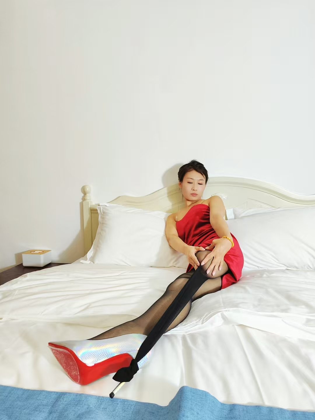 Ayla wore a beautiful tube-top red dress and elegant black silk stockings.