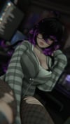 Hues & Material Swaps: Color hue with anything purple (belly piercing, nails, choker, necklace, tattoos), along with her hair emissions (only the primary hair colors), eye hue. Along with a silver to bronze metal swap. She has a toggle for her tattoos and for the the fishnets to be toggled off.