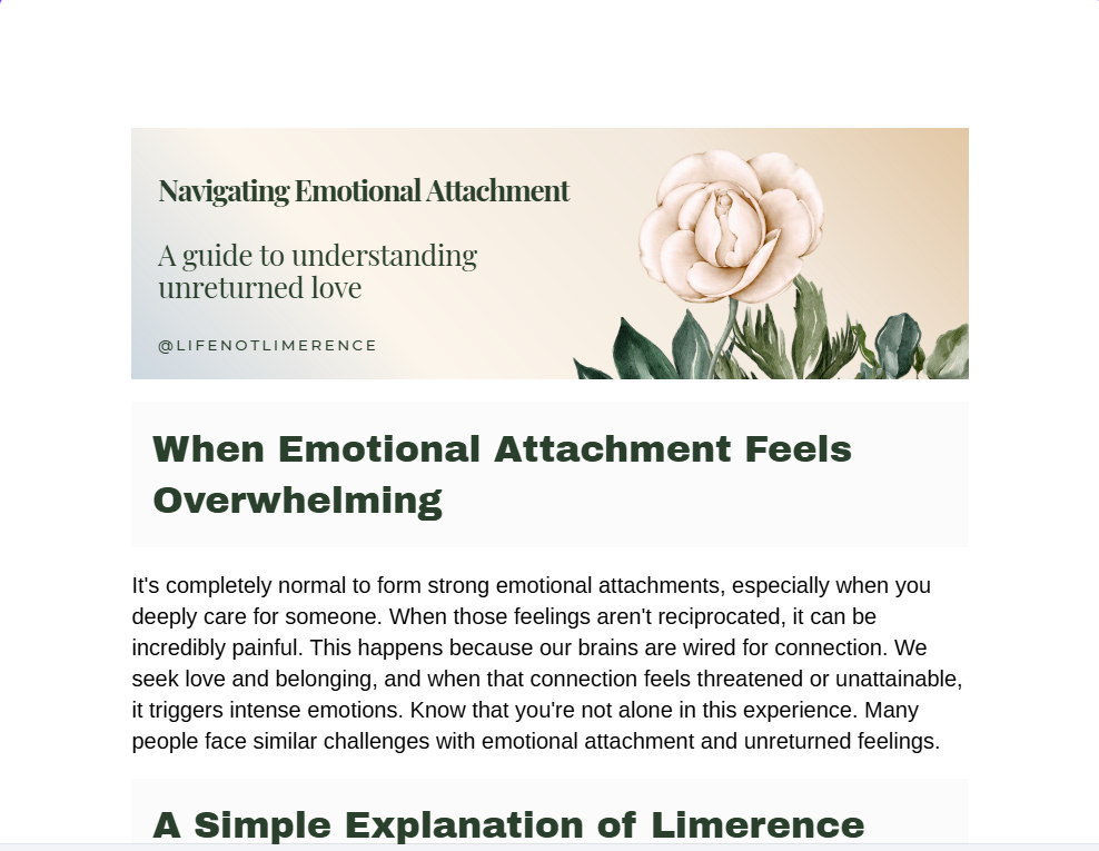 Unreturned love can feel overwhelming, confusing, and deeply personal. This short, supportive guide is designed to help you understand emotional attachment and limerence with compassion — not judgment.
