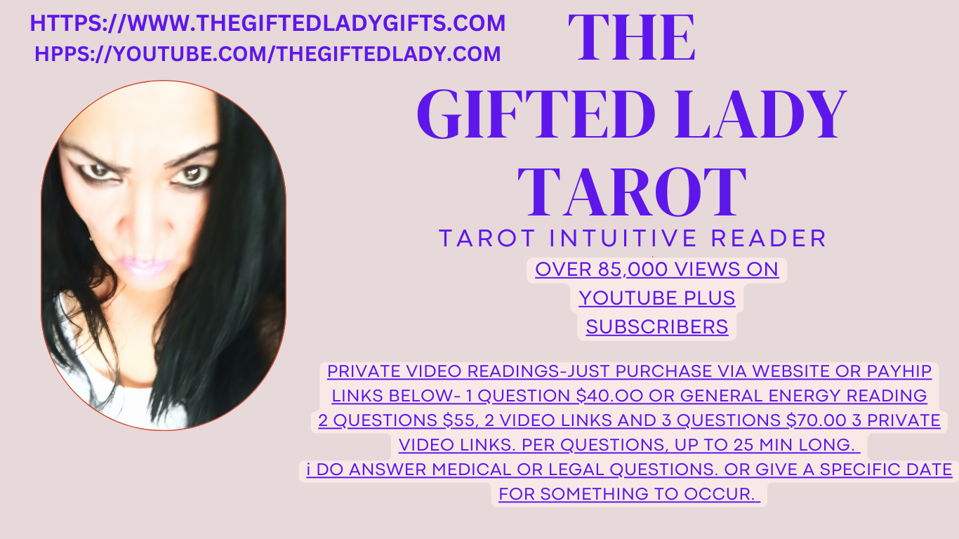 Private Video Tarot Intutive Readings available. BOOK A READING WITH ME WITHOUT LEAVING YOUR HOME. I HAVE OVER 85,000 VIEWS ON MY YOUTUBE CHANNEL, LISTEN TO MY READINGS AND DECIDE. VISIT MY WEBSITE TO BOOK A 25 MIN PRIVATE READING. YOU MUST PURCHASE /BUY IT FIRST, THEN THERE IS A 24-72 HR WAITING PERIOD UNLESS YOU NEED AN EMERGENCY READING. ONCE YOU BOOK THE READING YOU WILL RECEIVE A PRIVATE LINK TO VIEW YOUR VIDEO READING. GO TO THE FOLLOWING SITES TO GET MORE INFORMATION. Readings Cost- $40 per 25min, 1-3 questions or overall energy reading.