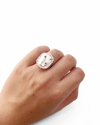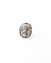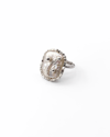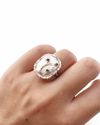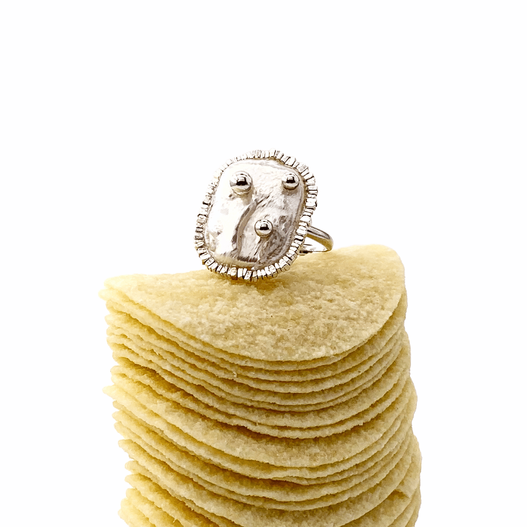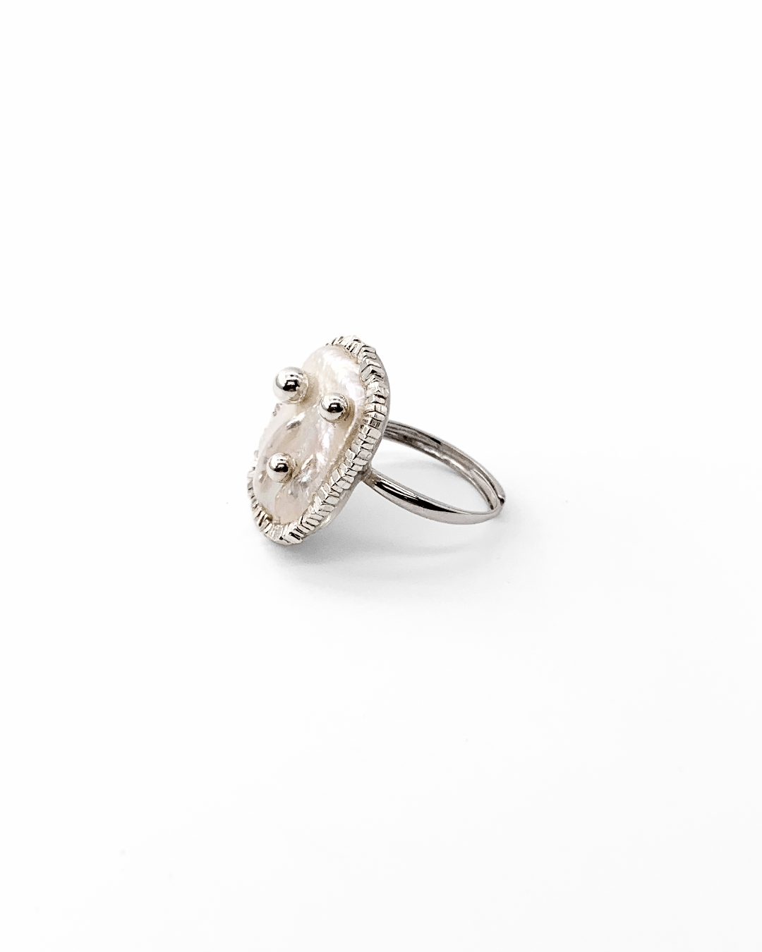At the center lies an irregular pearl, encased in fractured silver like a star shielded by orbiting debris. Three raised silver dots punctuate the surface—like satellites tracing invisible paths around a core of quiet gravity.
