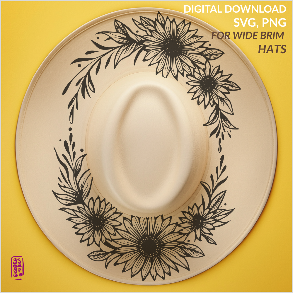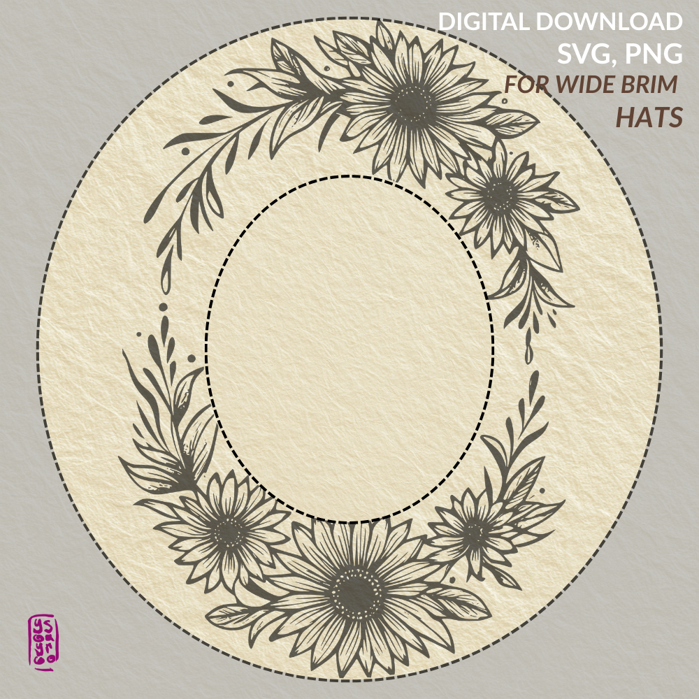 SUNFLOWER WREATH HAT DESIGN: Bold Botanical Laser Engraving Template for Wide-Brimmed Cowboy Hats - SVG/PNG