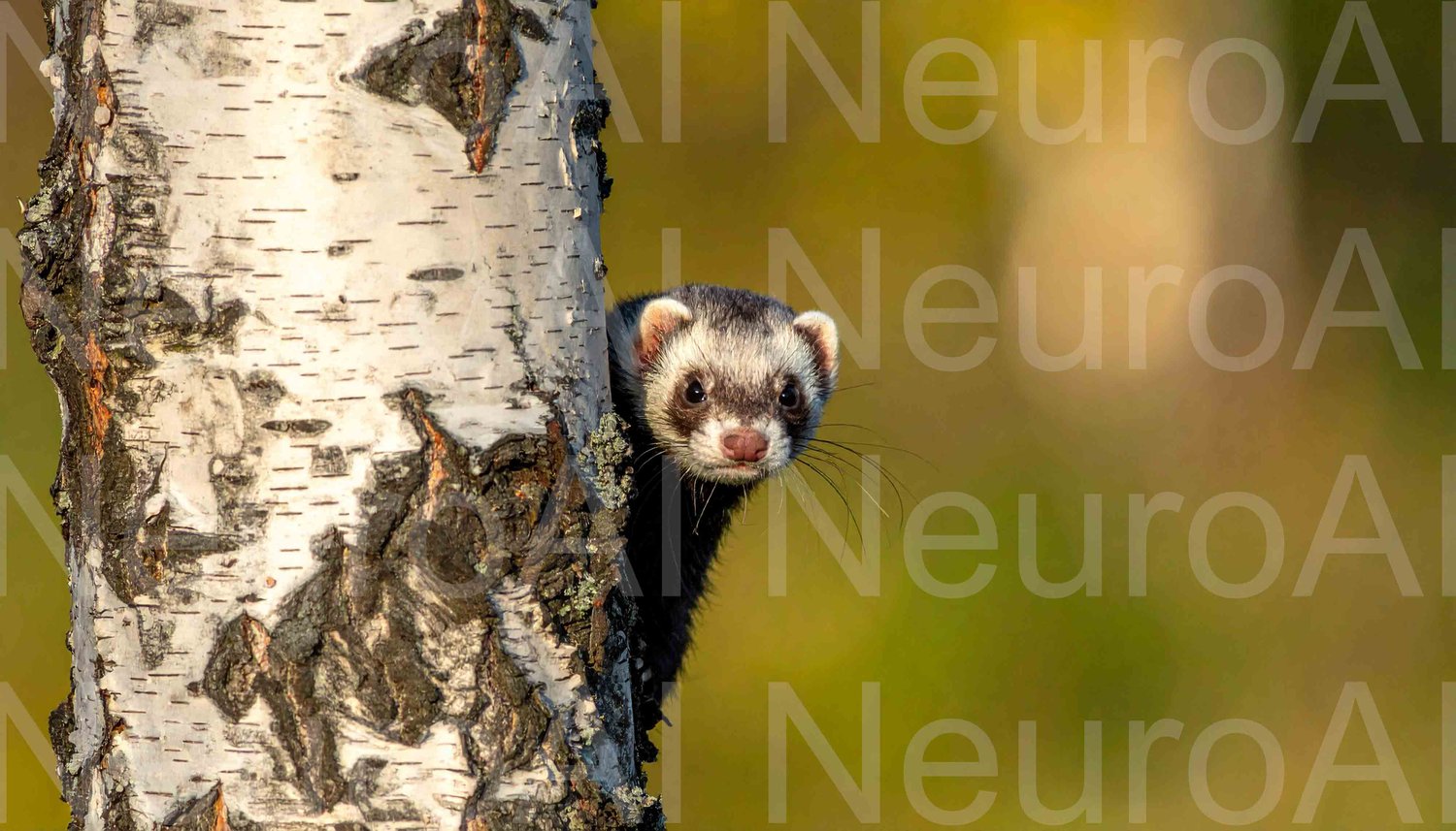 Curious ferret peers out from behind birch tree