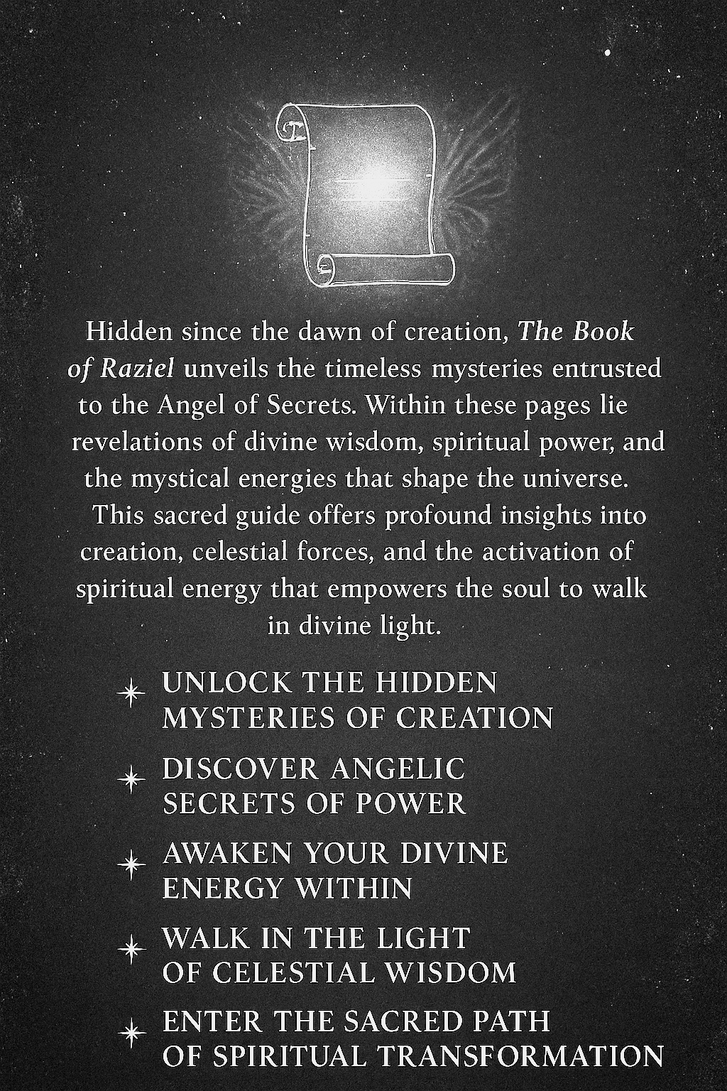 According to sacred tradition, when Adam and Eve were cast out of Eden, Raziel gave Adam this very book so he could still walk in the light of divine understanding. Throughout history, sages and mystics preserved it as a treasure of heavenly knowledge, a map to the spiritual realms, and a key to unlocking divine mysteries.