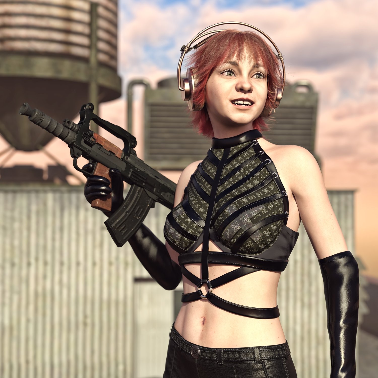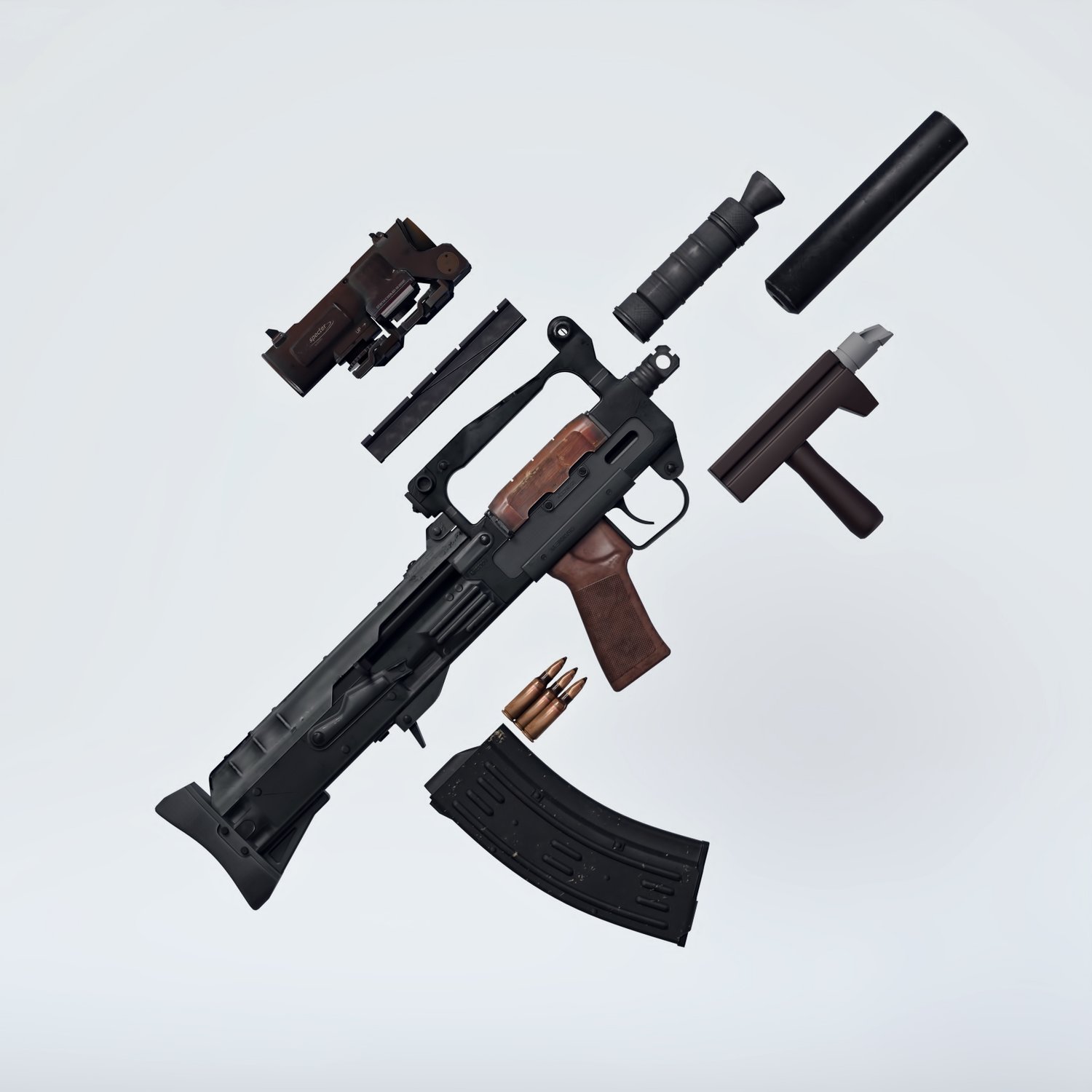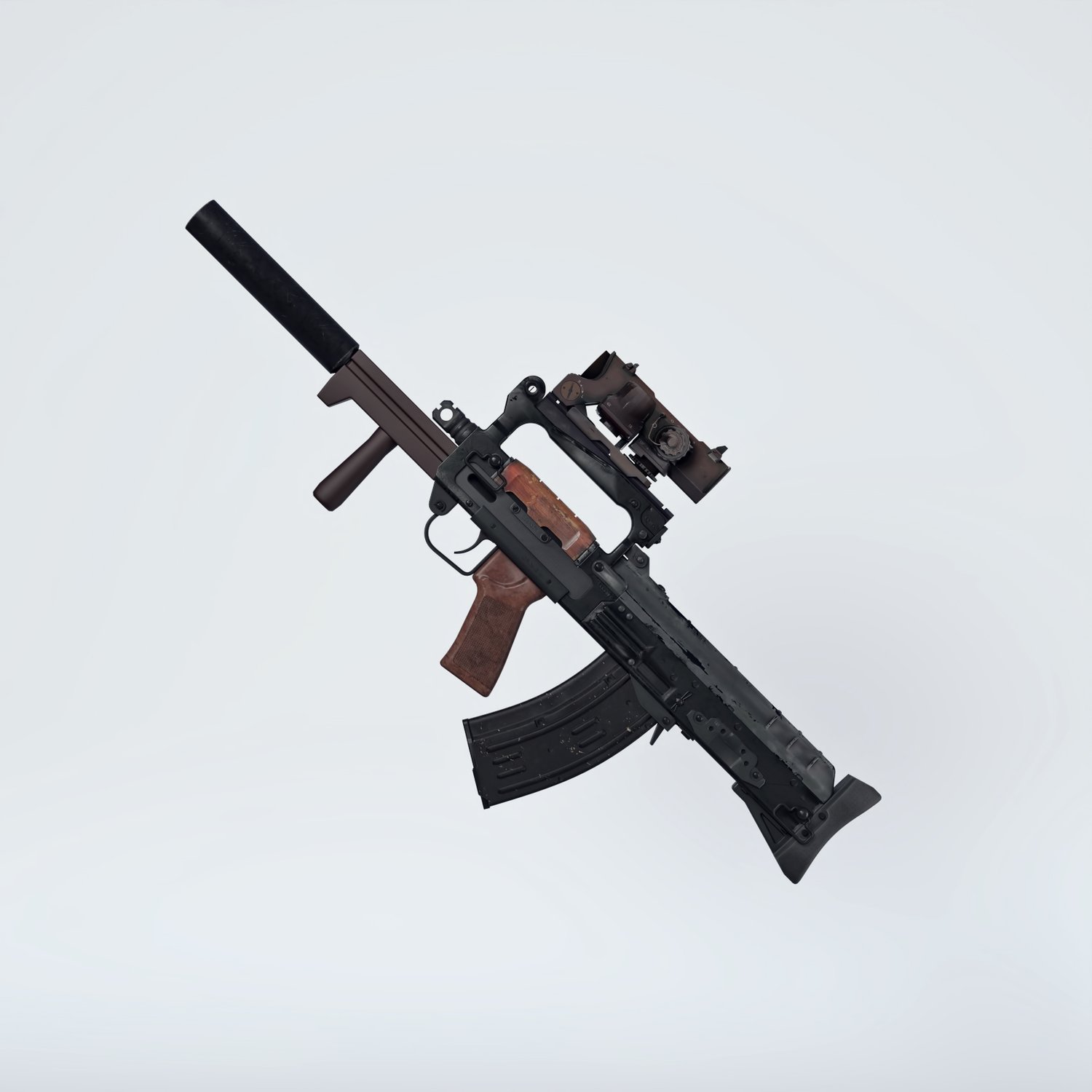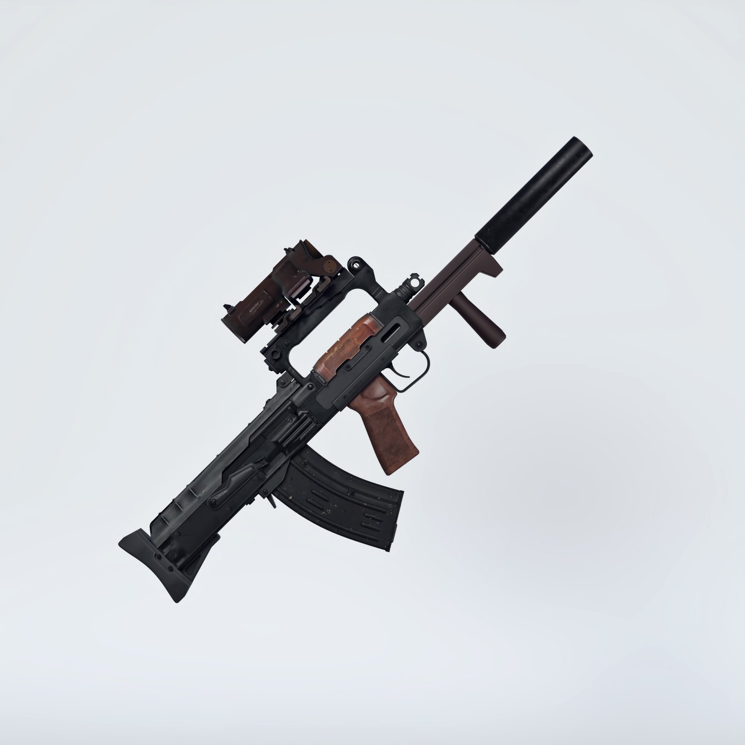 A very cool combat rifle, that never seen a wide use. A bullpup modification of AK rifle, for special forces. Rigged and converted for use with DAZ. Used by spetsnaz and other special forces for a compact size and good punch. Trigger, safety, bolt, etc also rigged for more realistic pictures. Includes a red dot sight for various porpoises and pictures. Also includes 2 kinds of barrels (longer with a grip and very short) and a silencer.