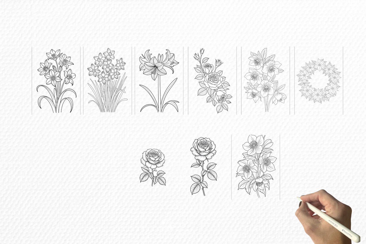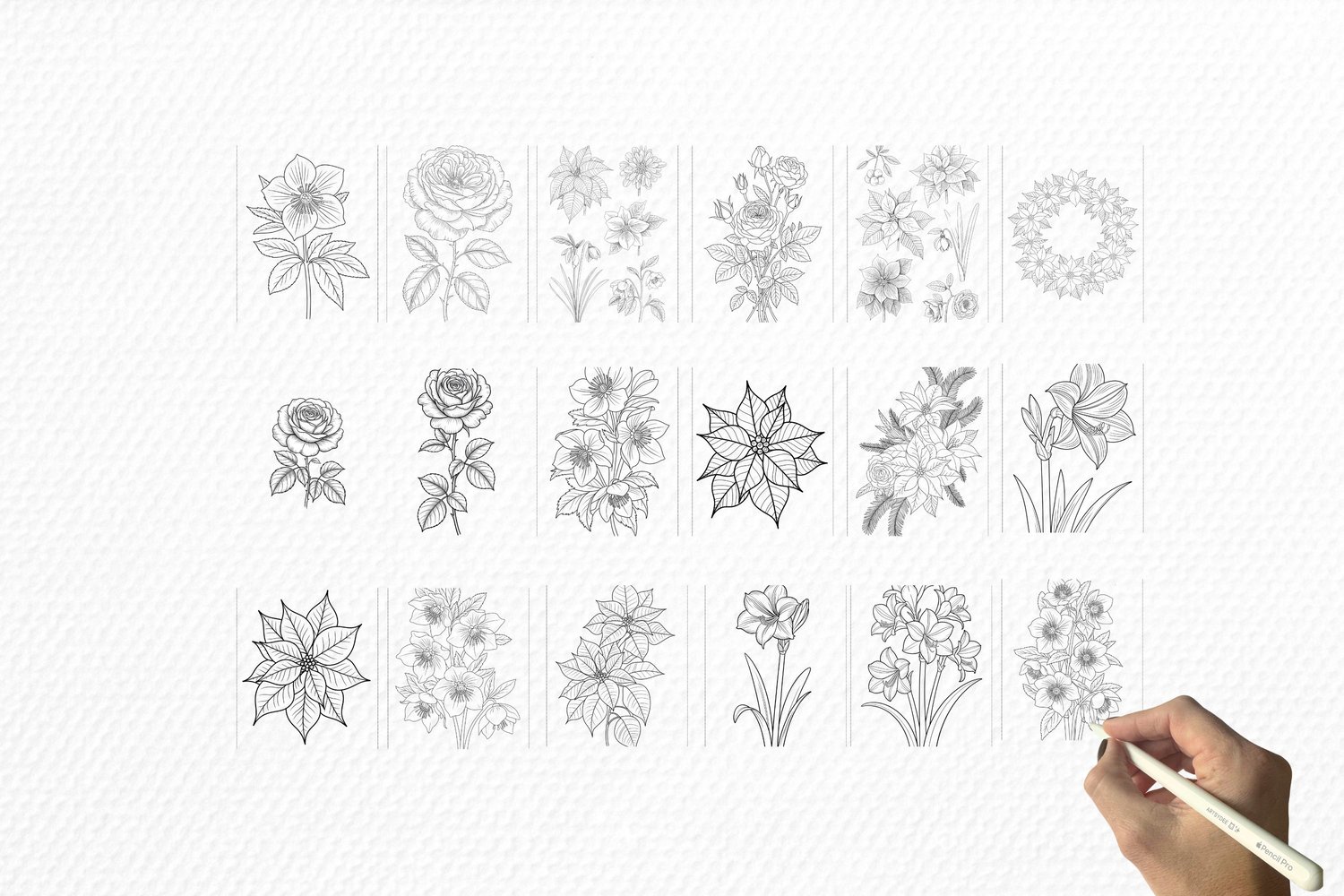 Winter Florals watercolor sketch outlines, Flowers Watercolor Templates, flower digi stamps, Cardmaking, Procreate PNG, digital stamps png,