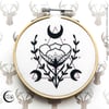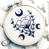 Embroider a touch of magic with this beginner-friendly floral pattern! This downloadable PDF pattern features a beautiful bloom and three crescent moons with a witchy aesthetic. Created using only basic stitches, making it perfect for those new to embroidery. Sized for a comfortable 4-inch hoop, this project is both manageable and rewarding, especially if you're new to the craft.