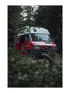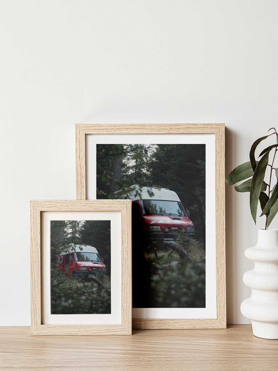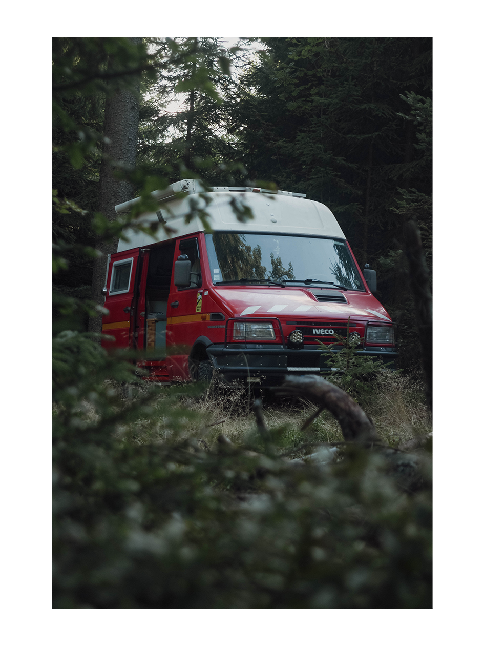 Ce jour-là, en revenant vers mon campement après une série de photos de nature, je suis tombé sur une scène toute simple : Marco, mon van de pompiers, posé au milieu des arbres, à moitié dissimulé par les branchages. Et sans trop réfléchir, j’ai voulu le photographier lui aussi. Je me suis rendu compte que, malgré son rouge éclatant, son métal, ses lignes humaines et fabriquées, il avait trouvé une certaine place au cœur de cette forêt. La lumière se reflétait doucement sur sa carrosserie et le rendait presque harmonieux dans cet environnement profondément naturel.