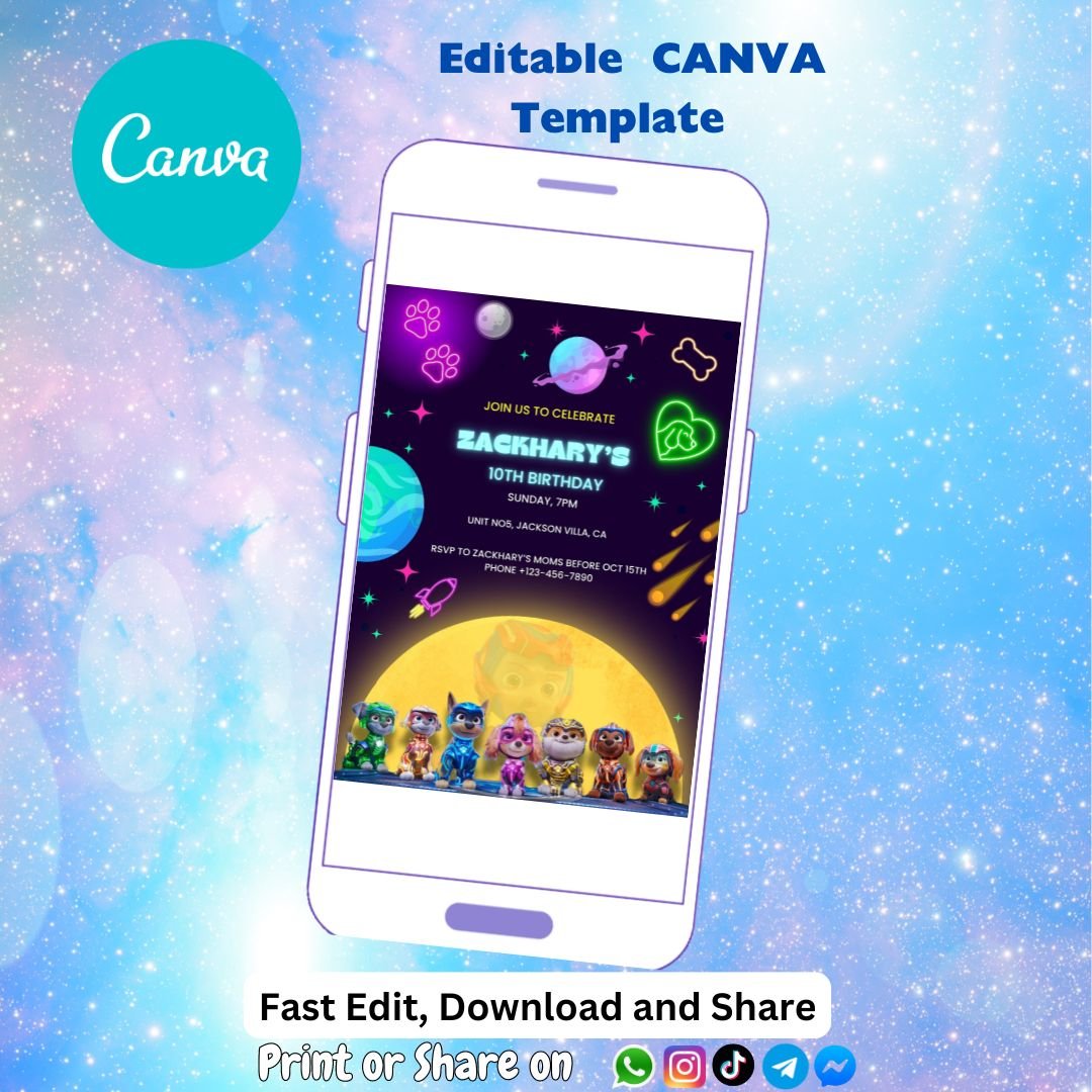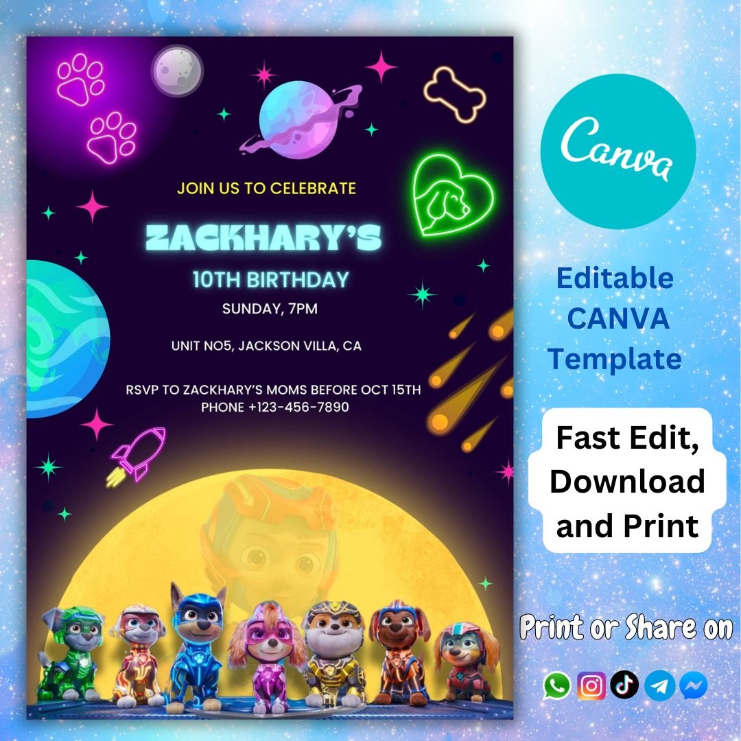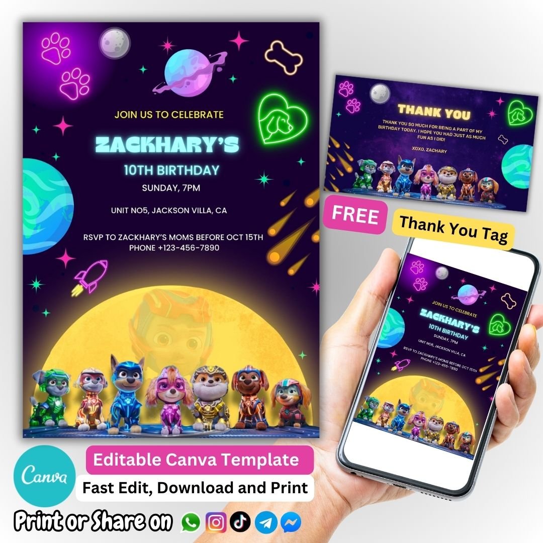 So why wait? Let the magic of Chase and his friends come alive with our Neon Paw Patrol The mighty Movie 2023 Birthday Invitation. Order yours today and get ready to witness the smiles and laughter of your little one and their friends as they embark on a Neon Paw Patrol The mighty Movie 2023-inspired adventure at the party of a lifetime.