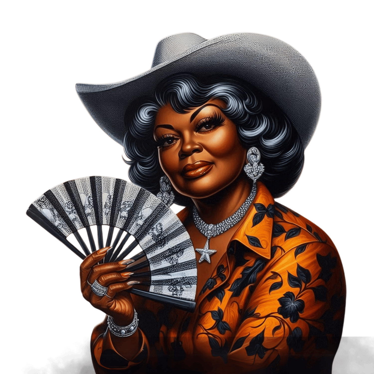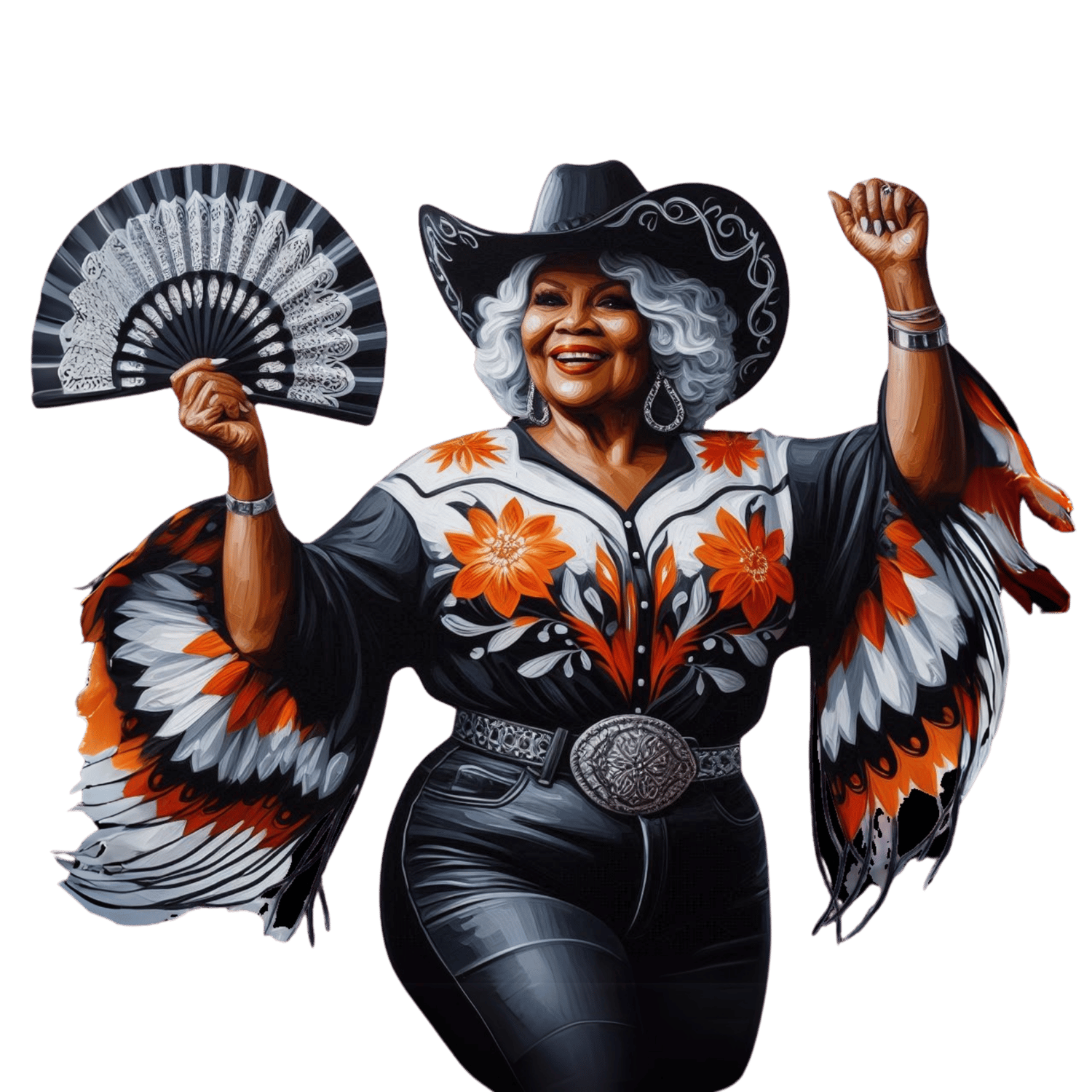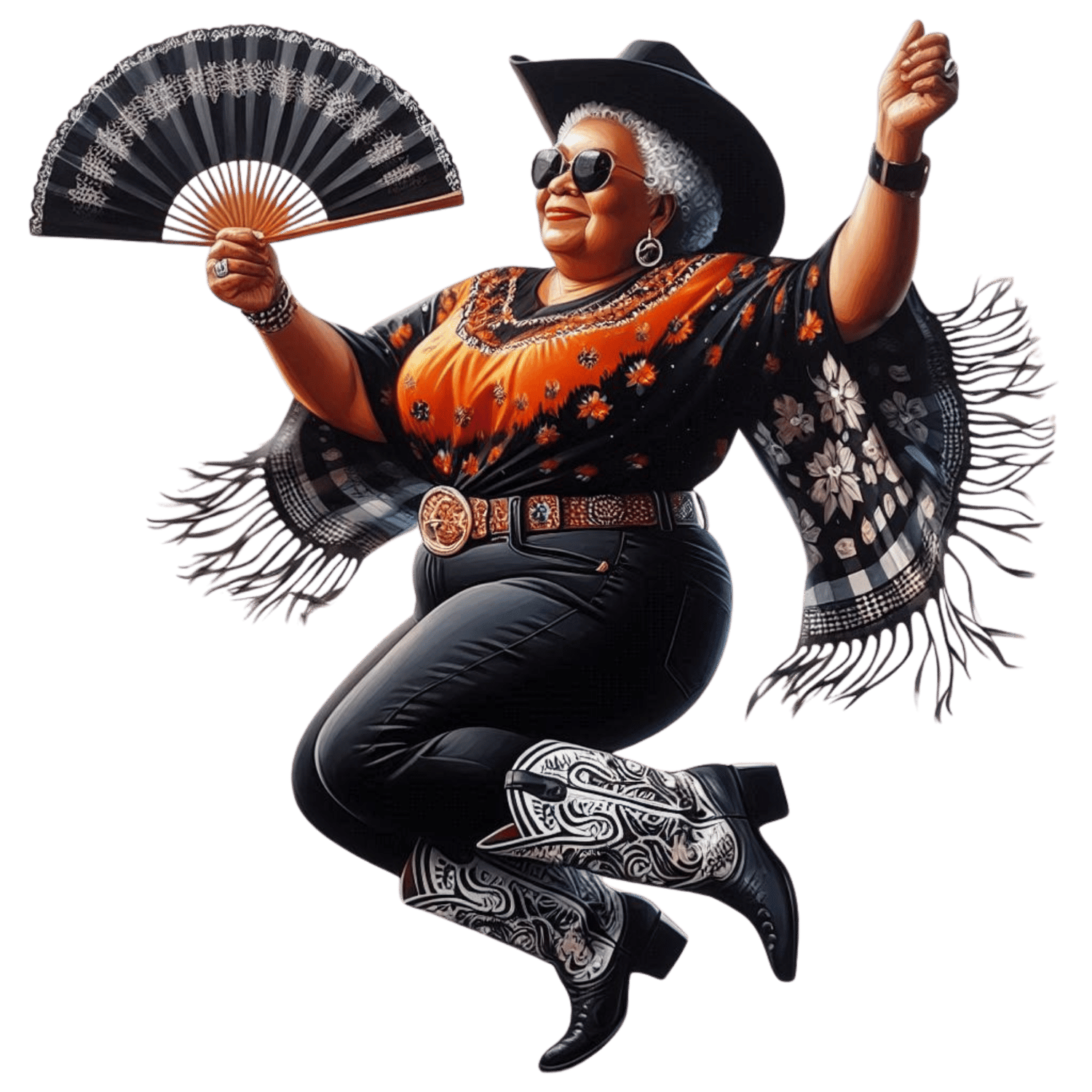 Cowgirl Boots on Da The Ground Black Senior Woman Clack Fan Design Orange Black Line Dance PNG Transparent Background