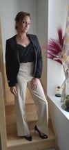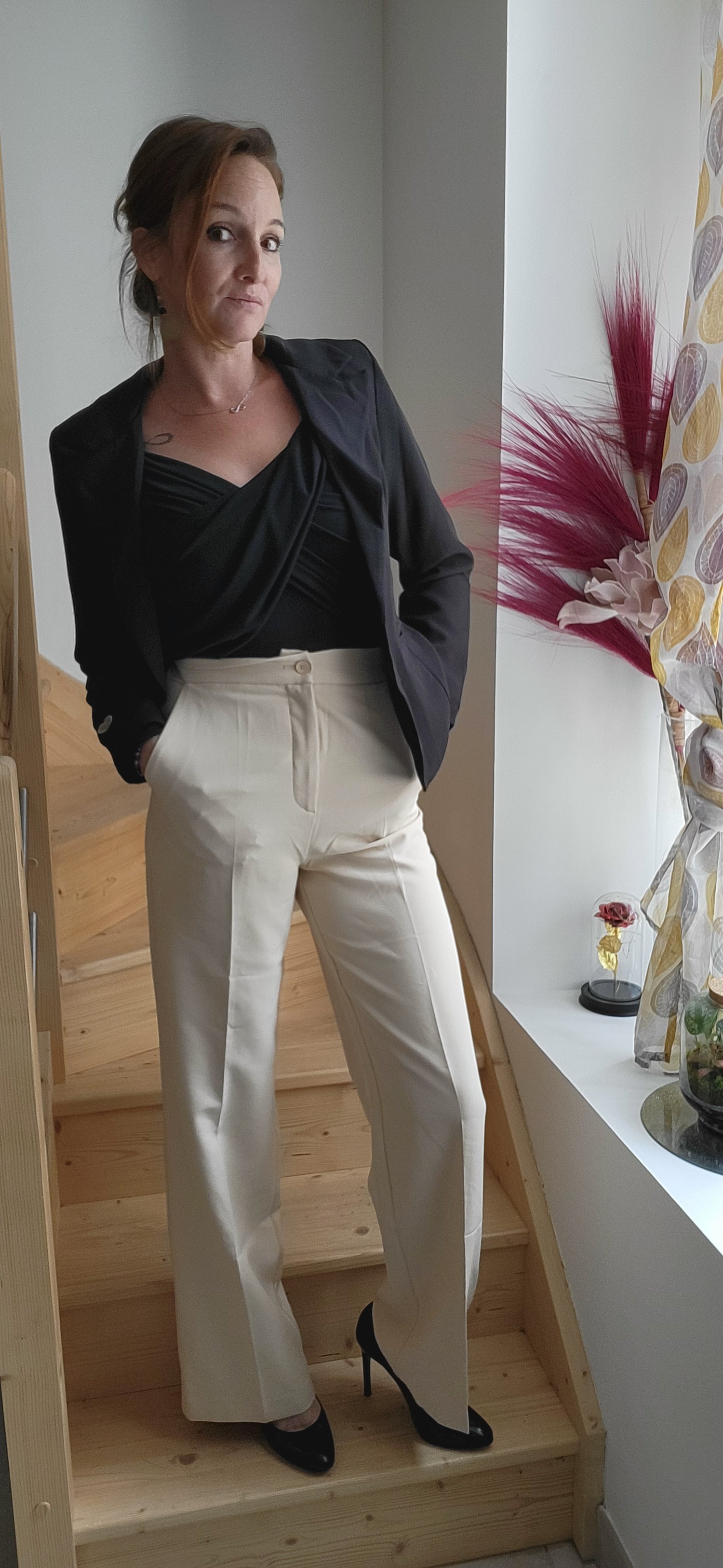 Élégant et intemporel, ce pantalon droit beige à pinces allonge la silhouette et se porte aussi bien au bureau qu’en sortie.