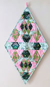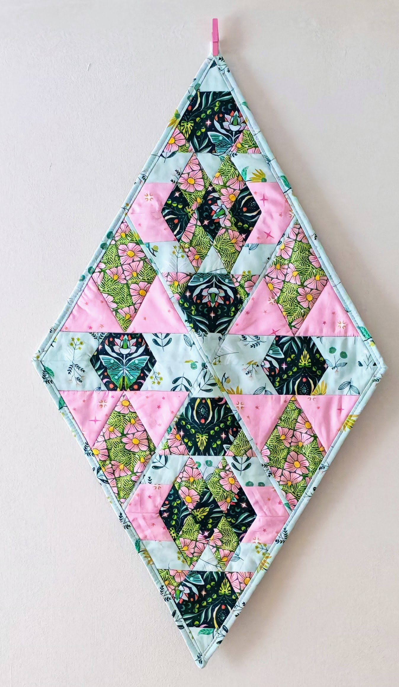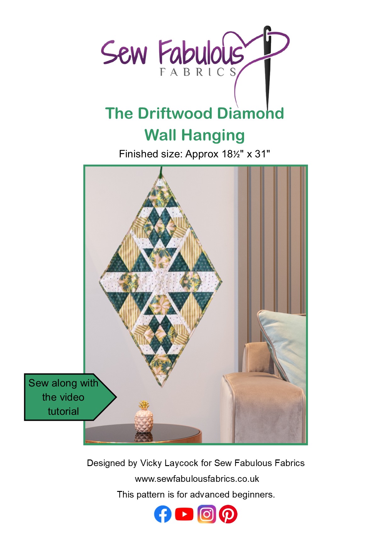 The Driftwood Diamond Wall Hanging is made up of four separate diamonds. There are two designs and two blocks to make of each design. The four diamond blocks are then stitched together to make a diamond shaped wall hanging. The accompanying YouTube video shows how to cut hexagon shapes using a Sew Easy Hexagon Template or a quilting ruler, and 'y' seams!