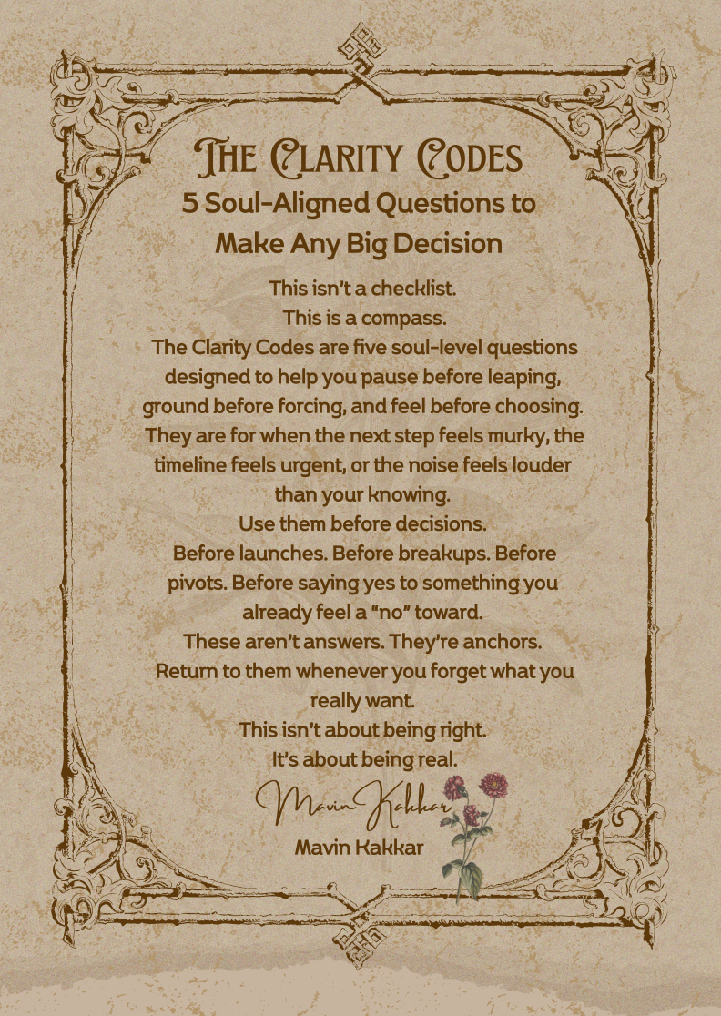 The Clarity Codes are five soul-level questions designed to help you ground before forcing, pause before leaping, and feel before choosing. Created for spiritual entrepreneurs, creatives, and sensitive beings navigating pivotal decisions, these codes reconnect you to the voice beneath the noise: your soul.