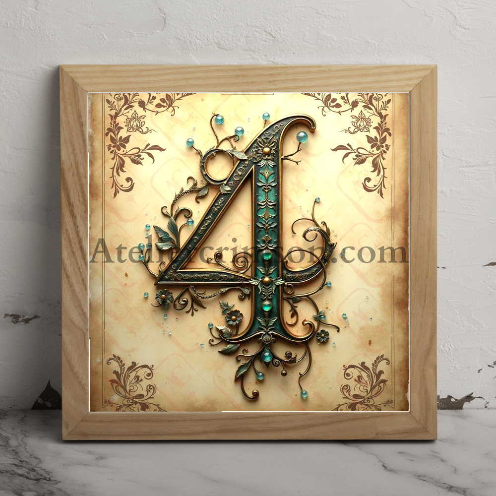 Number 4 Art Nouveau alchemical Each character crafted as a stunning 3D brass sculpture with weathered patina, set against a mystical alchemical parchment. Ornate vines, floating bubbles, and antique gears create a magical shabby chic atmosphere. Perfect for vintage-inspired designs, book covers, or unique wall art."