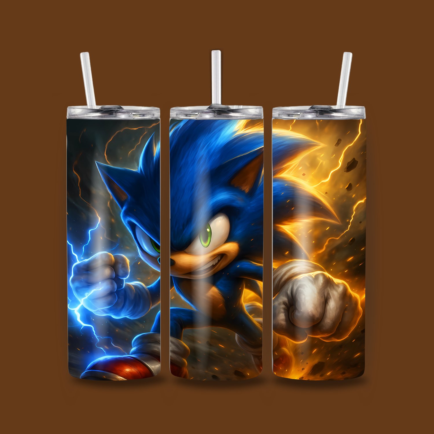 Fuel your day with speed and style! This 20oz stainless steel tumbler features a bold, high-energy action design inspired by a fast-moving blue hero. Wrapped seamlessly around the cup, the artwork showcases dynamic motion, electric details, and vibrant colors that stand out from every angle.