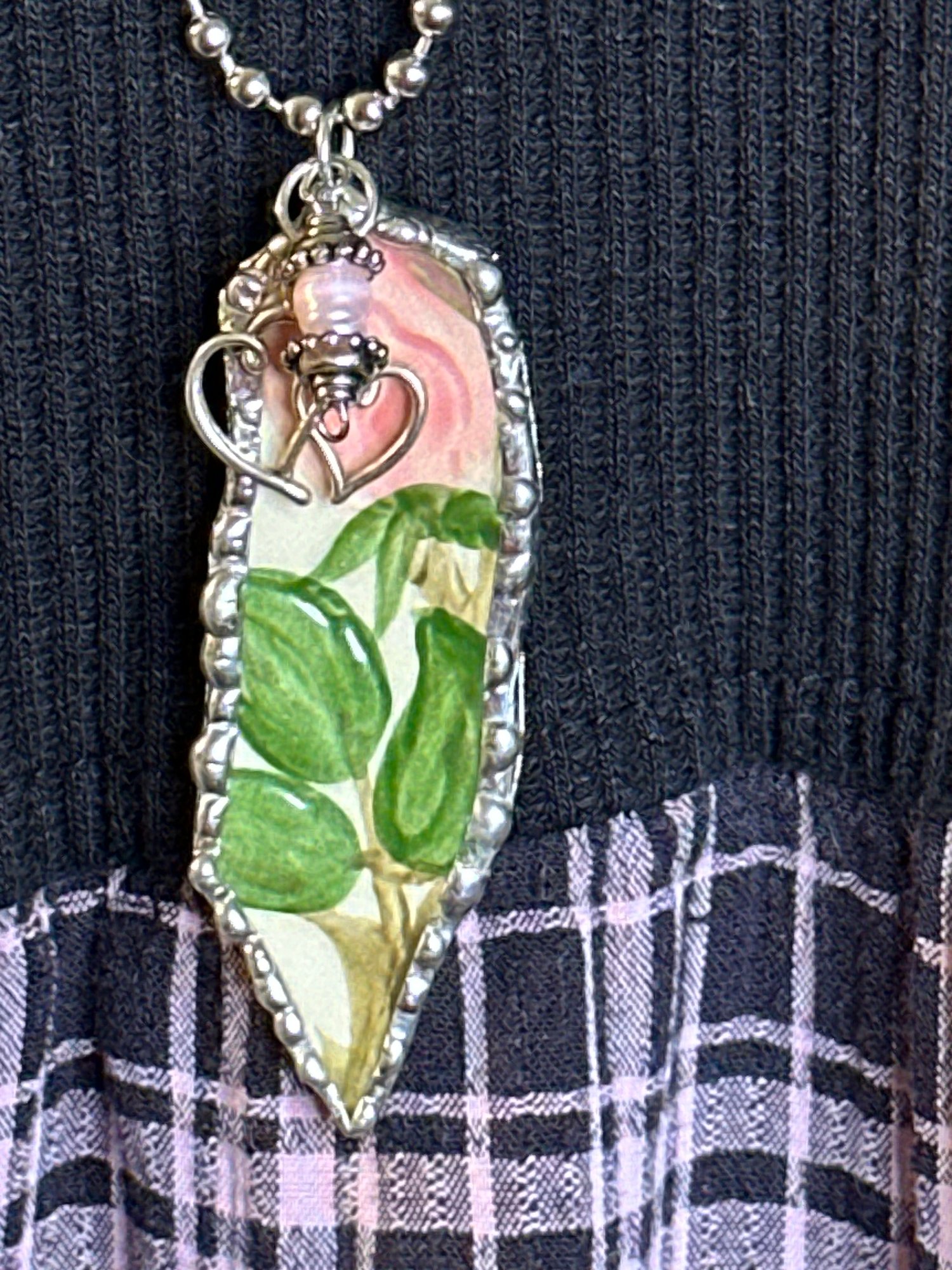 This elegant necklace features a hand-cut shard of vintage china showcasing a delicate pink rose and soft green leaf design. The pendant is framed in silver solder with a faceted edge for subtle shine. A dainty pink glass bead and silver heart charm complete the piece, adding a romantic and feminine touch. Perfect as a gift or a statement piece for your own collection.