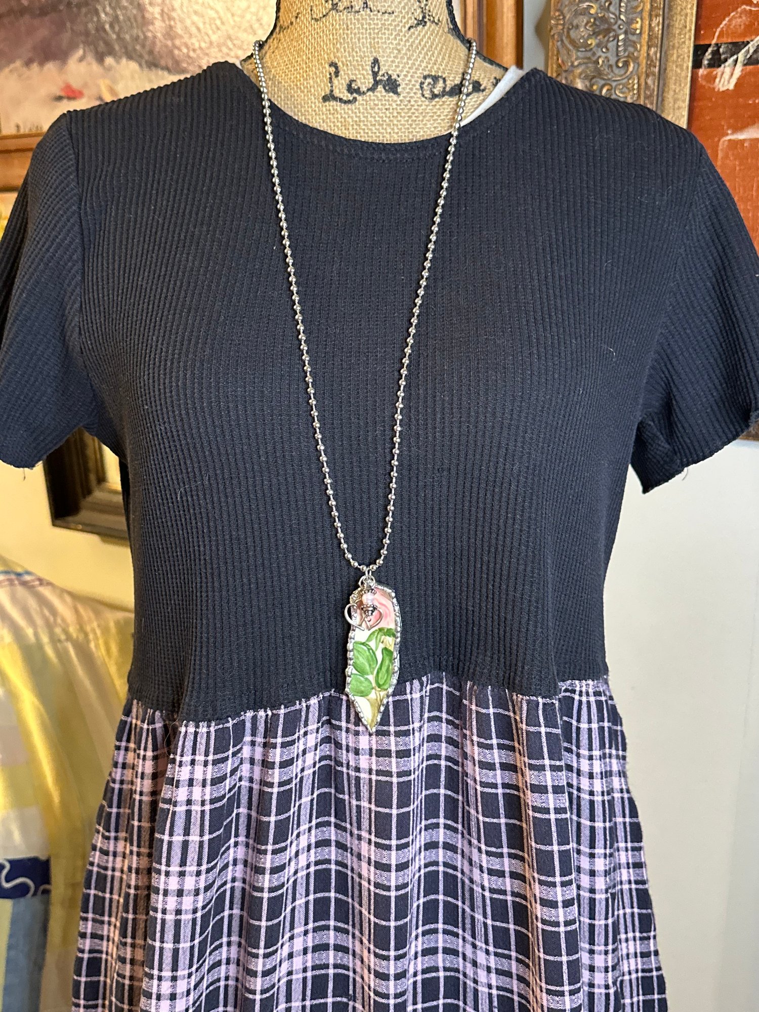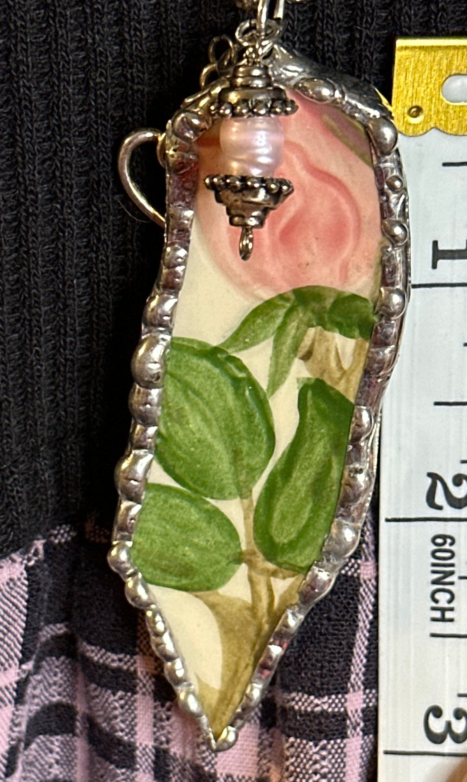Pink Rose & Green Leaf Broken China Pendant Necklace