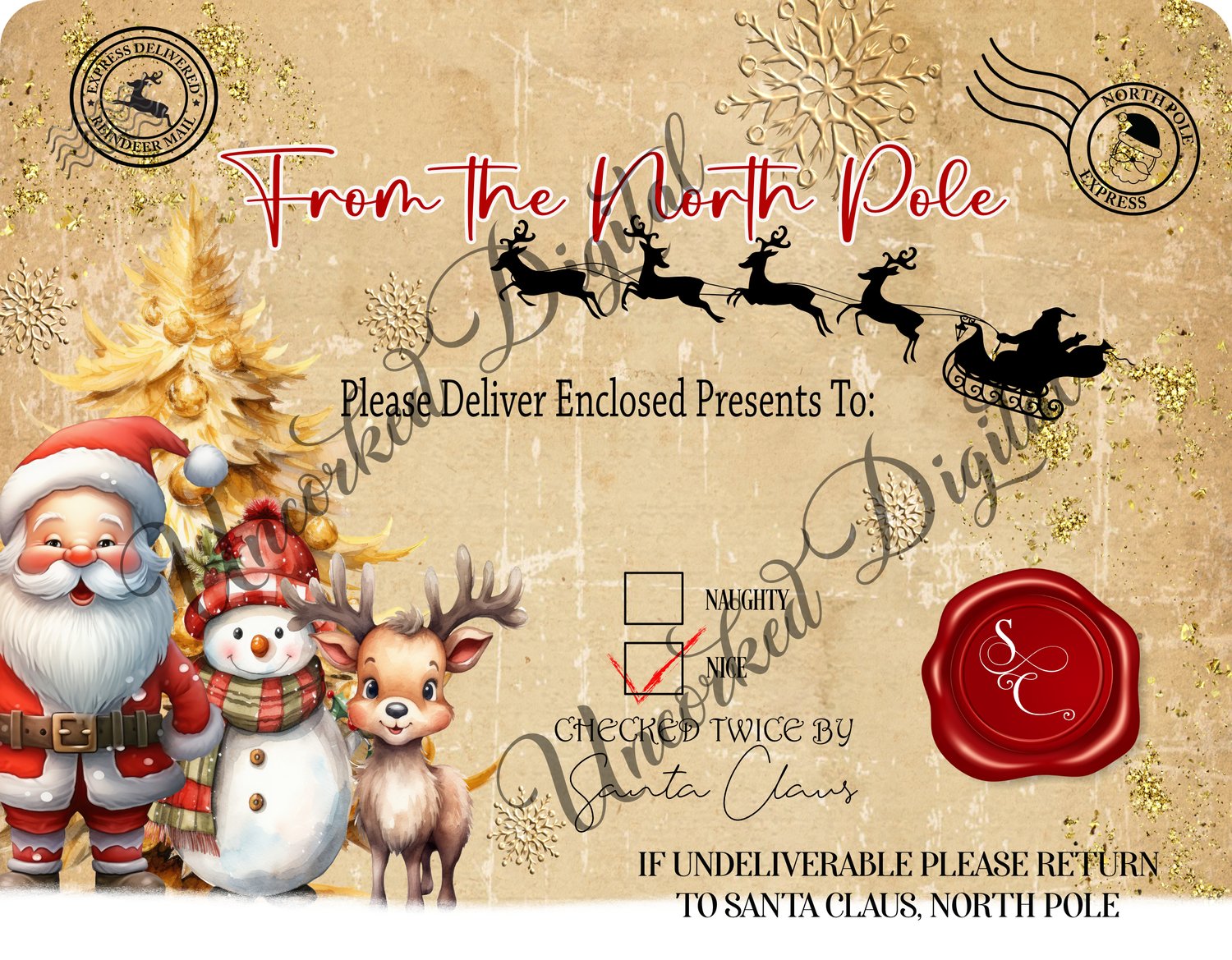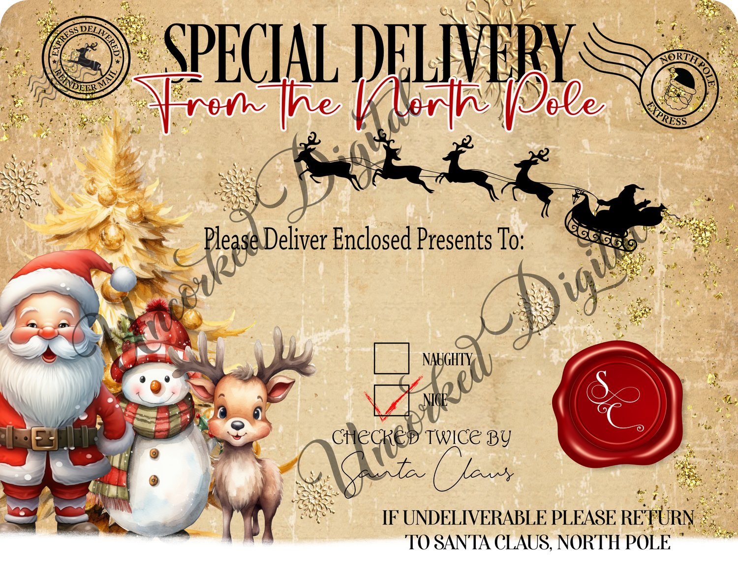 Special Delivery, Hot Chocolate Kit & Hot Chocolate Mug Wraps 6 & 11oz, Santa Stop pennant and Sleeps till suction square (woodform)