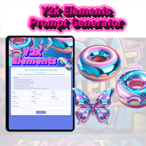 Step into the holographic era with this Y2K Elements Prompt Generator — your ultimate tool for creating hyper-realistic 3D elements that shine with candy-coated reflections, metallic gradients, and holographic glow! ✨