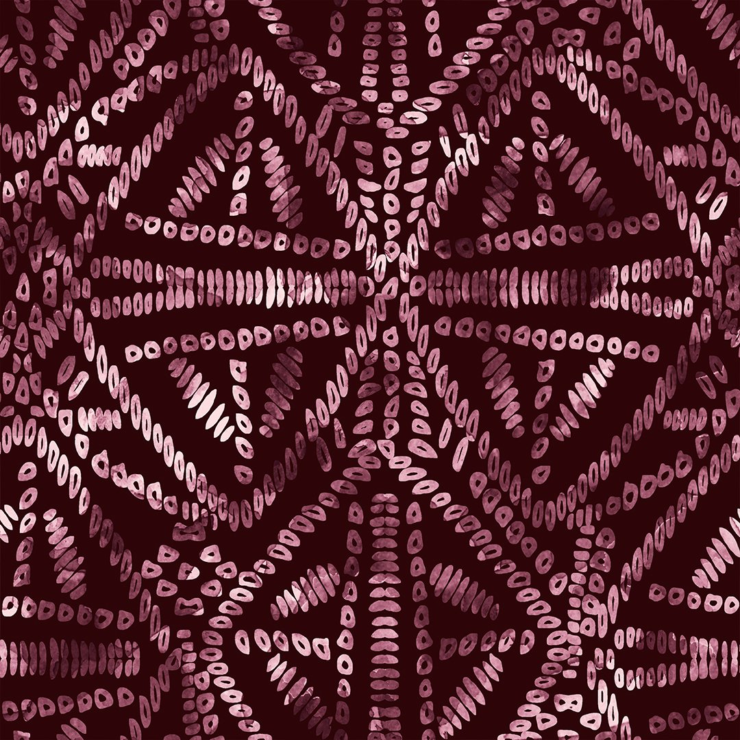 Symmetrical tribal diamonds & dashes in pink-purple on maroon base