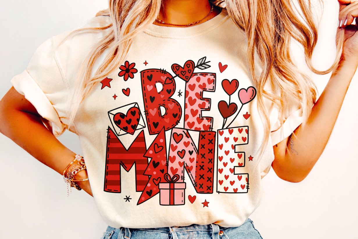 This adorable “Be Mine” Valentine design is full of sweet charm and playful details! Featuring bold, hand-drawn lettering filled with hearts, love notes, balloons, and a cute gift accent, this design is perfect for spreading all the Valentine vibes. The fun red, pink, and black color palette makes it eye-catching and festive—perfect for tees, sweatshirts, and more.