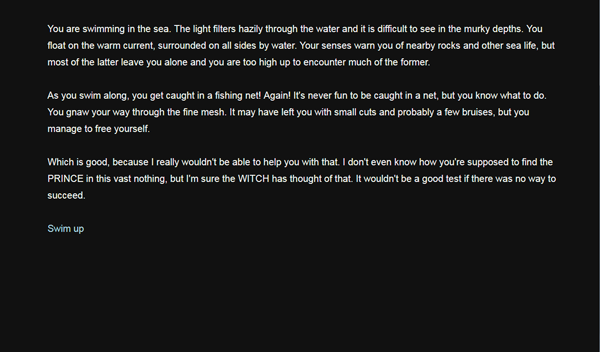 You soon learn that things aren't, quite, what they seem in this short interactive meta-fictional CYOA game. Your Prince Has Drowned started life as a short story inspired by old school text adventures. Now it's been re-invented as a Twine game! Well, a Twine story where your choices can have serious consequences, really.