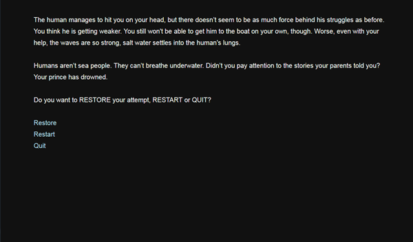 - To play Your Prince Has Drowned, upzip the file into a folder and open 'index.html' in your browser. As long as it runs Javascript, the game will play.