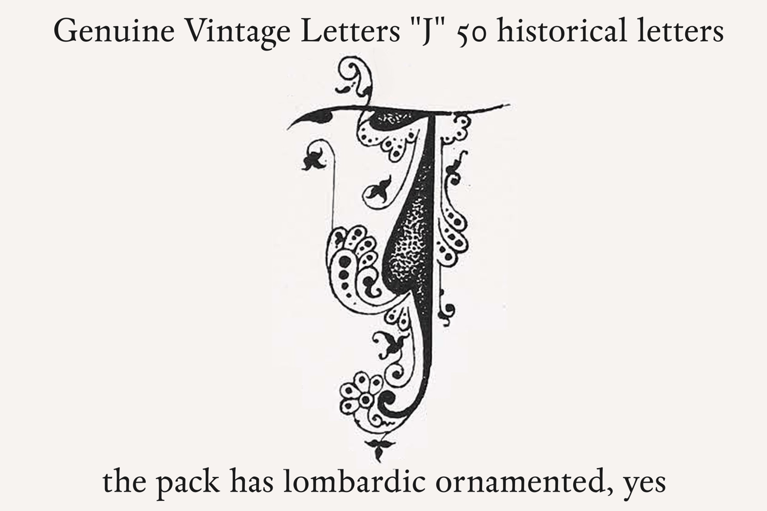 A authentic and genuine set of 50 (!!!) letters "J" from historical sources like old catalogues, books, magazines ad type specimens. Many historical periods and styles.Perfect to complete your artwork at drop caps uses, titles of books, ideas for folders, advertise, books covers, illustrations and much more.