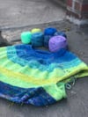 - Color E: 1 (1, 1, 1, 1) (1, 1, 2, 2,) (2, 2, 2, 2) skeins of“Aura” in Suri Silk, a variegated purple, blue, and green skein.