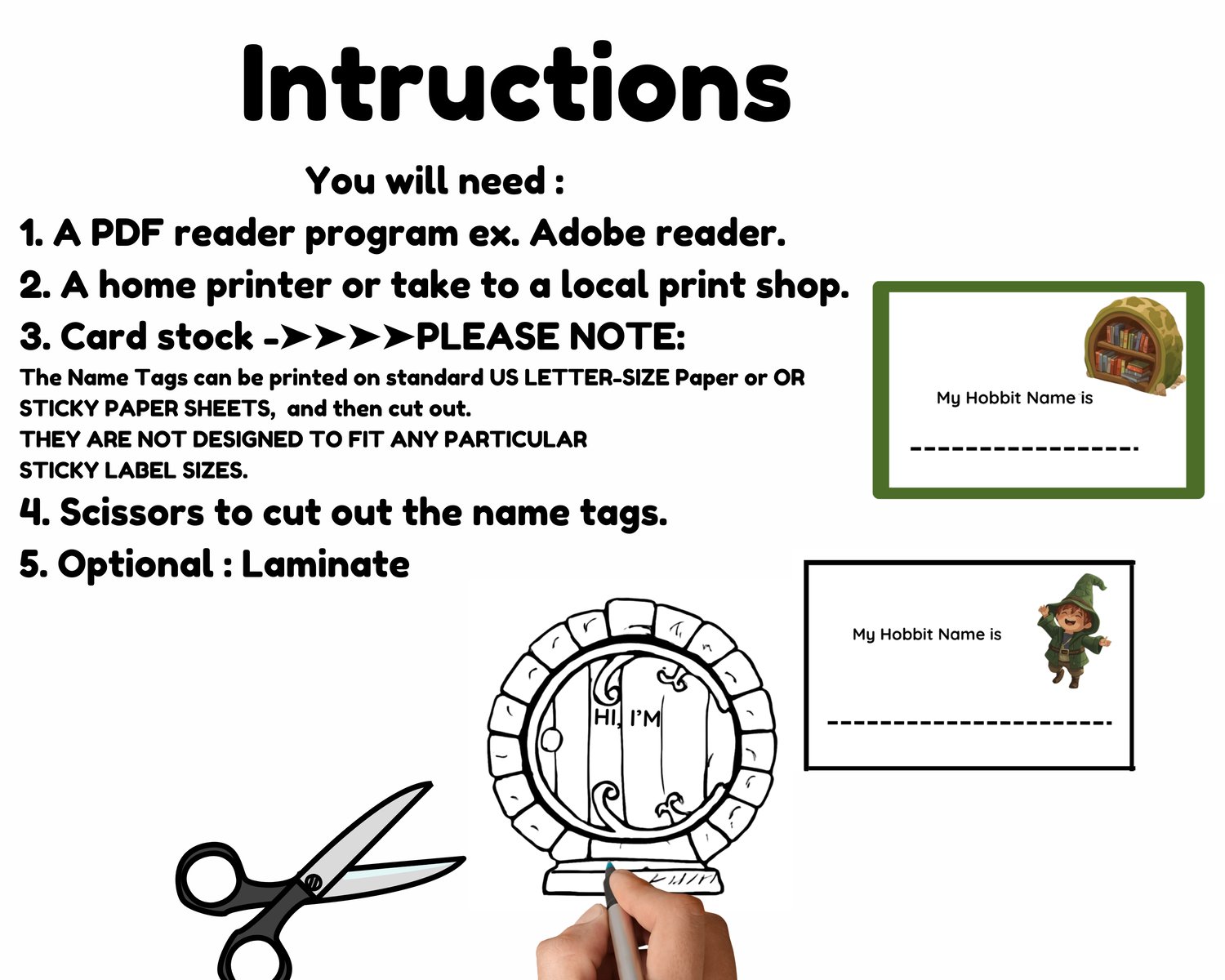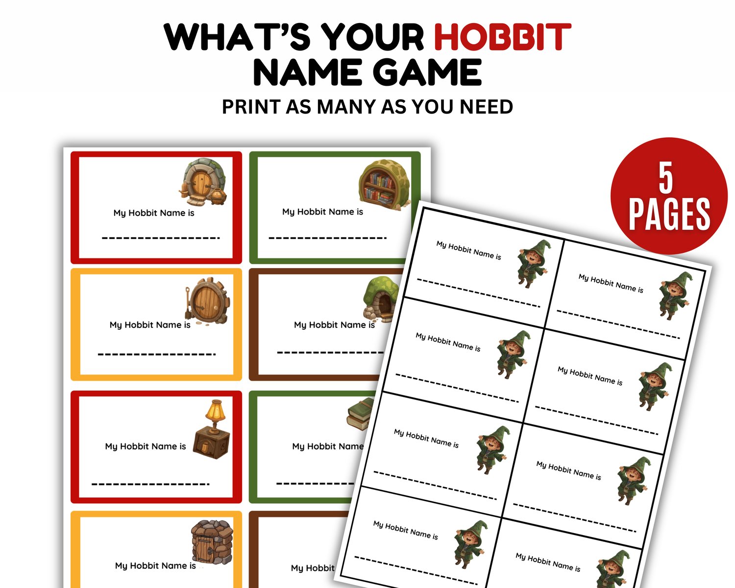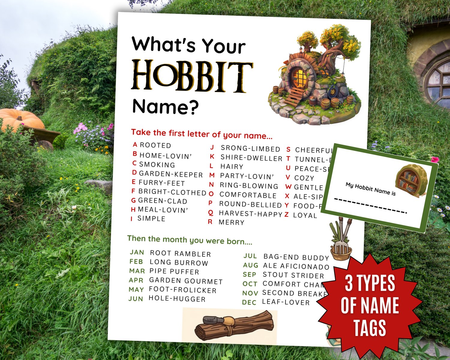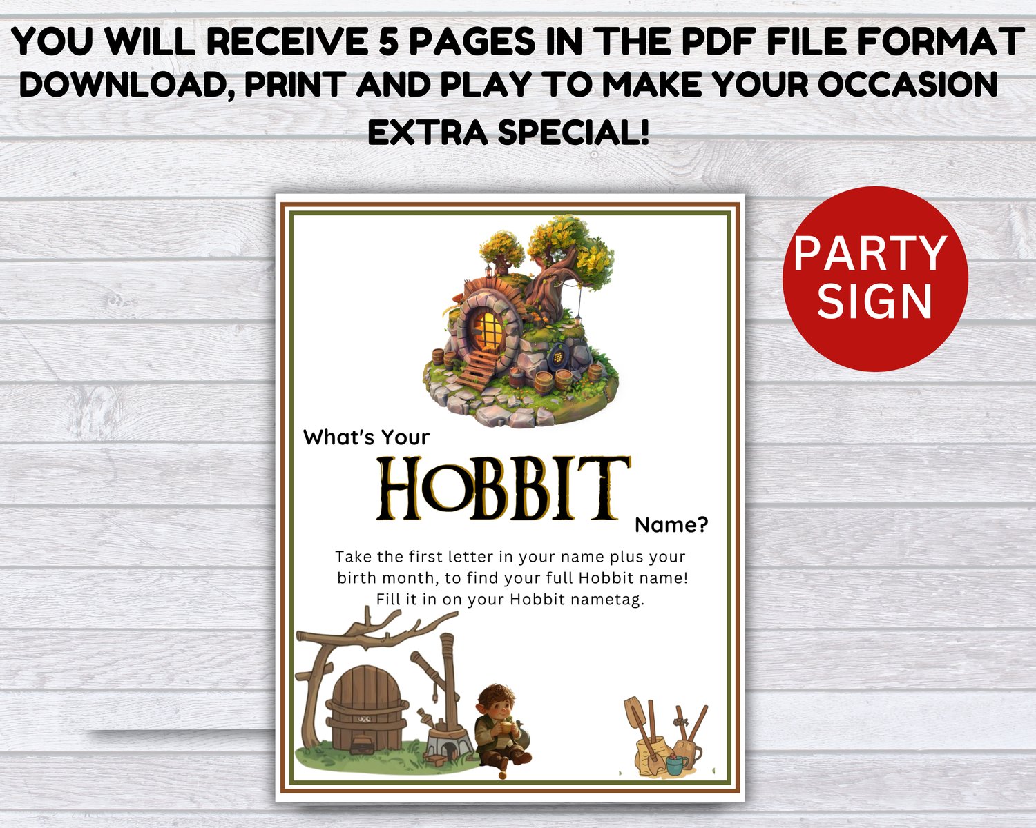 1 X PDF (5 Pages): includes 1 Hobbit Name Generator, 3 name tag templates, and 1 x Party Sign.
