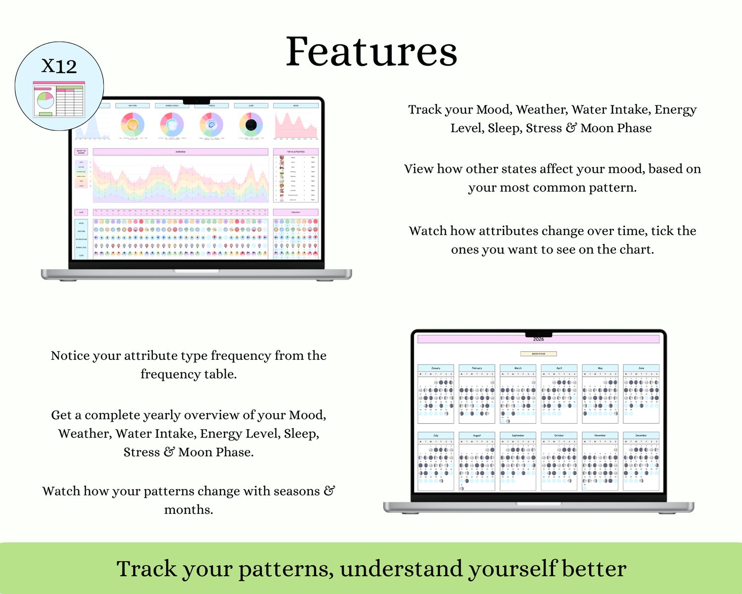 The Annual Dashboard & Calendar brings everything together so you can see your biggest patterns, progress, and habits throughout the year.