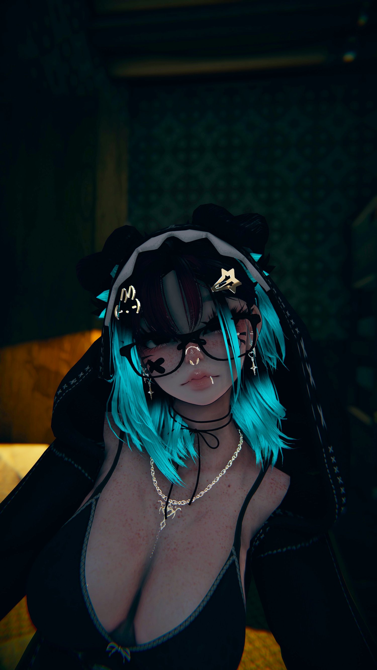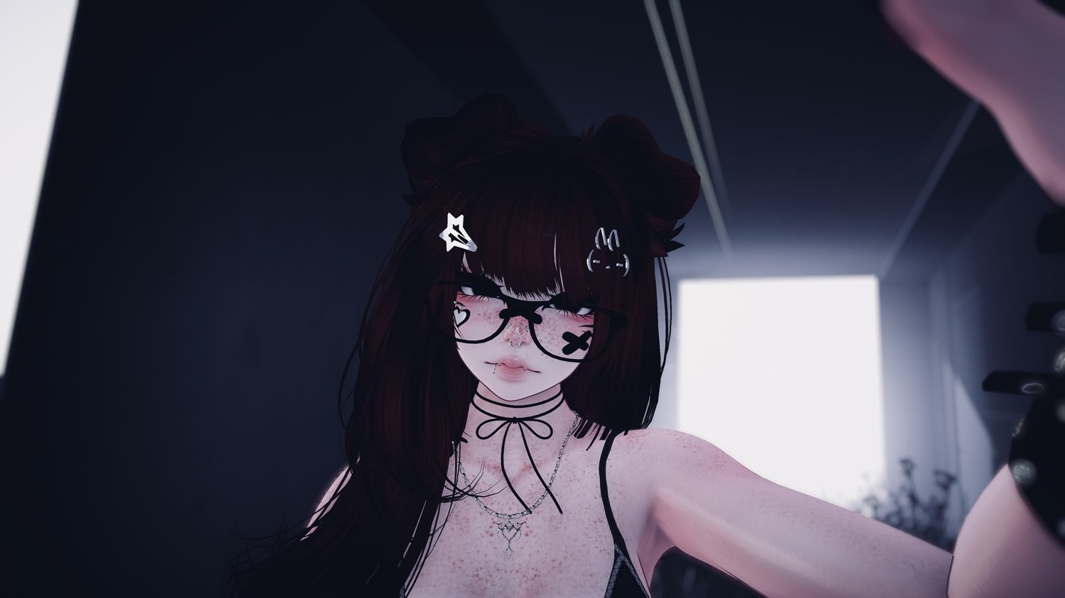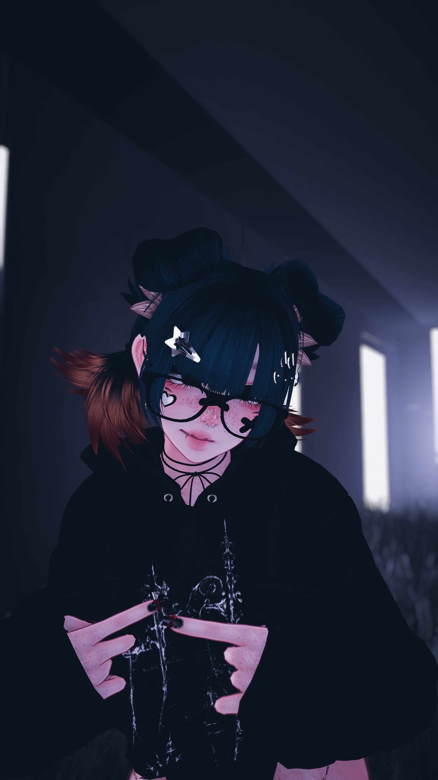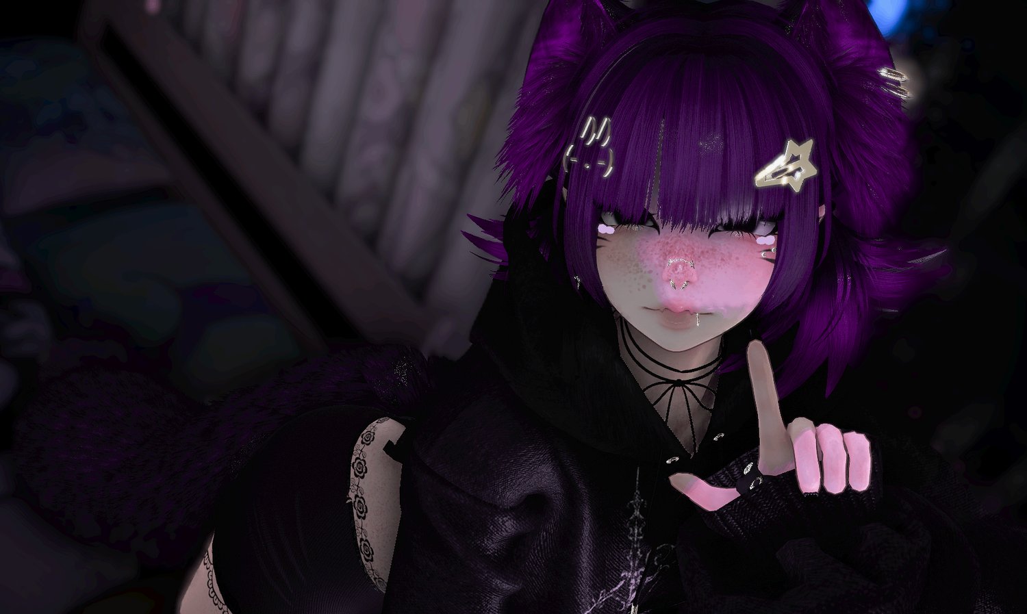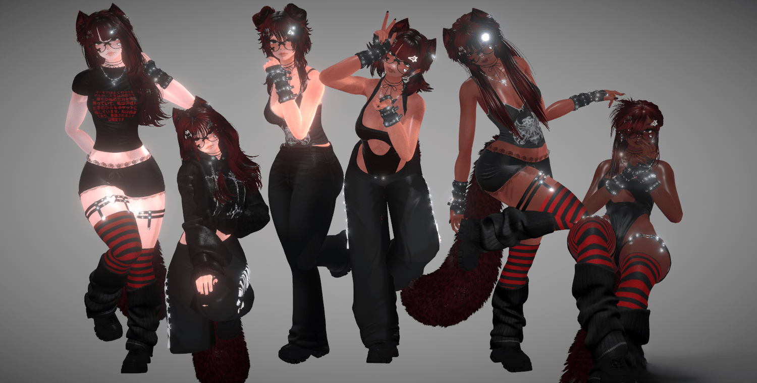 Accessories: arm warmers, bow choker, fluffy ears, Dog Ears, Garters, glasses, hair clip 1, hair clip 2, leg warmers, nails, necklace, Dad Sneakers, socks, tail, Cat a pillar Plush, Bandaids, Star Nose Piercing, septum, Earrings