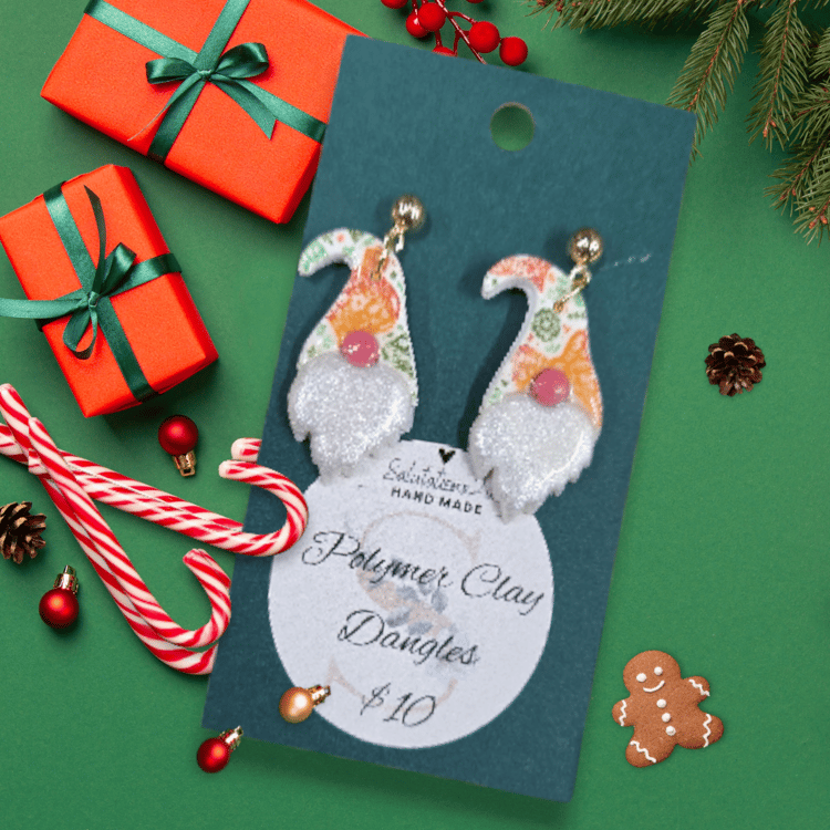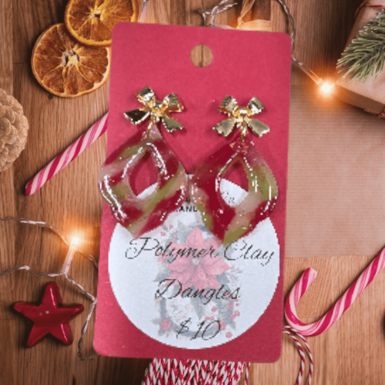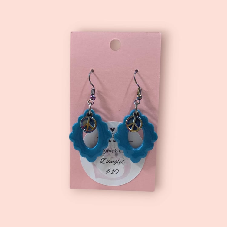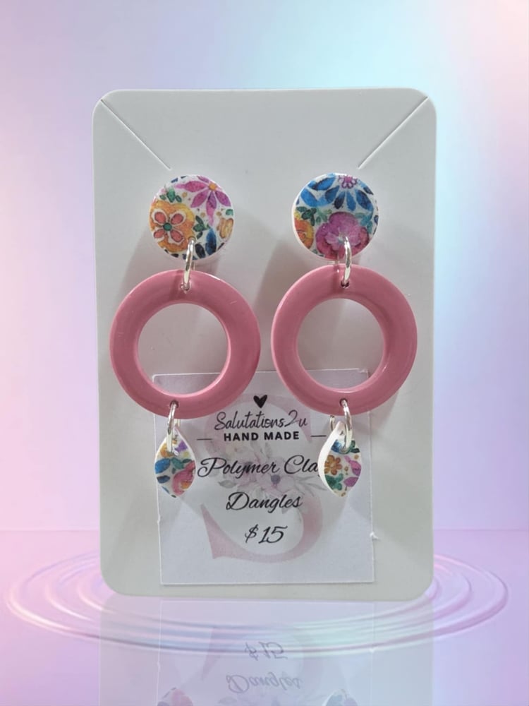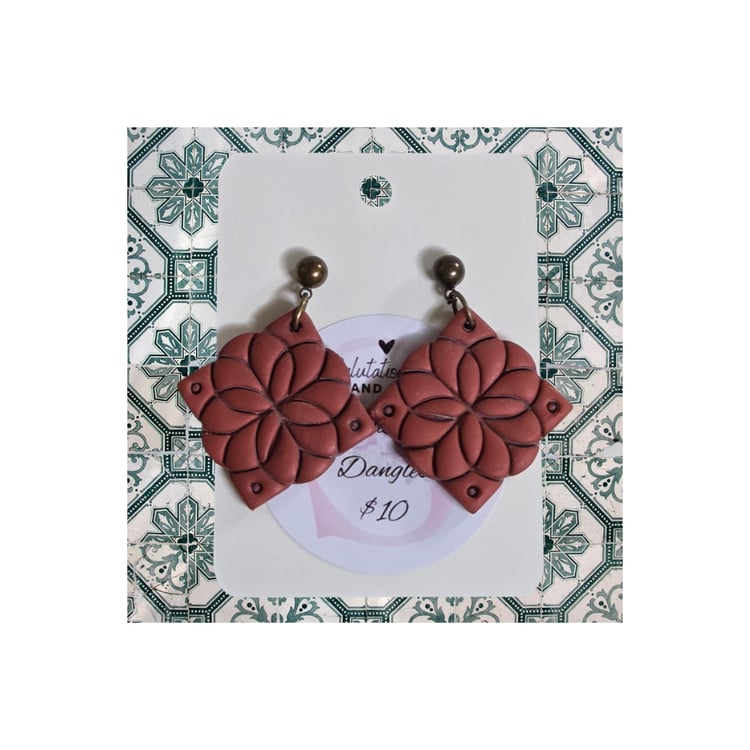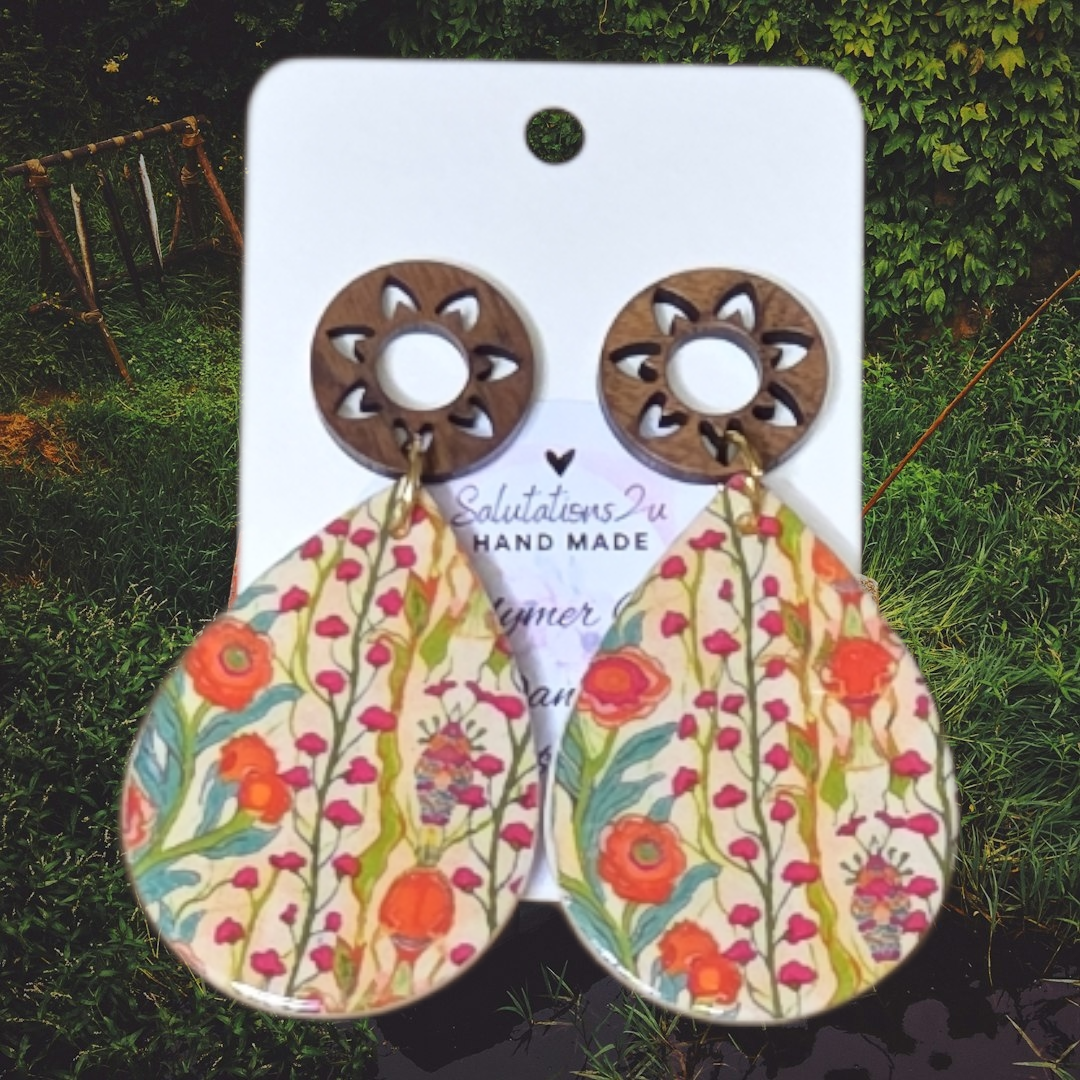 Bold statement dangle earrings made from polymer clay with printed transfer sheet designs, paired with carved wooden studs. Lightweight with vibrant floral detail and natural wood texture, they add an artistic, boho touch to any outfit.
