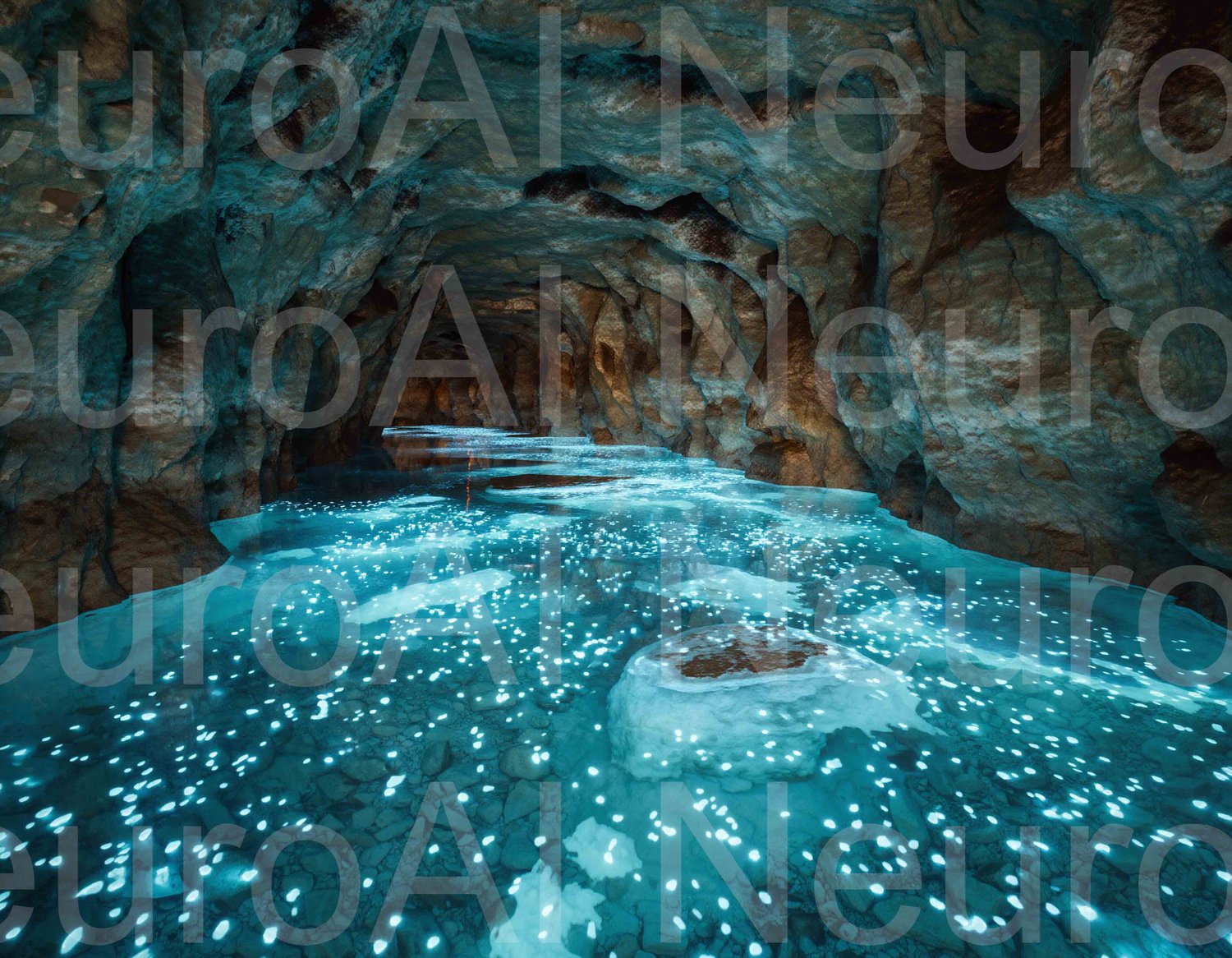 Magical cave river with glowing lights, serene scene